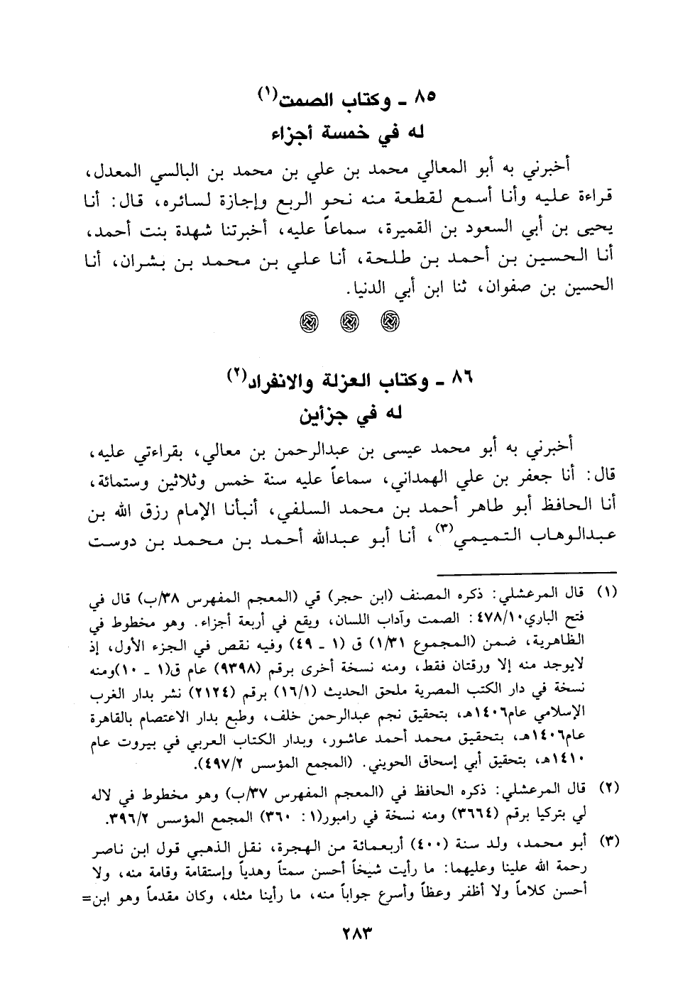 له في خمسة أجزاء أخبرني به أَبُو المعالي مُحَمَّد بْن علي بْن مُحَمَّد بْن البالسي المعدل، قراءة عليه وأنا أسمع لقطعة منه نحو الربع وإجازة لسائره، قَالَ: أنا يحيى بْن أَبِي السعود بْن القميرة، سماعا عليه، أخبرتنا شهدة بنت أَحْمَد، أنا الحسين بْن أَحْمَد بْن طلحة، أنا علي بْن مُحَمَّد بْن بشران، أنا الحسين بْن صفوان، ثنا ابن أَبِي الدنيا