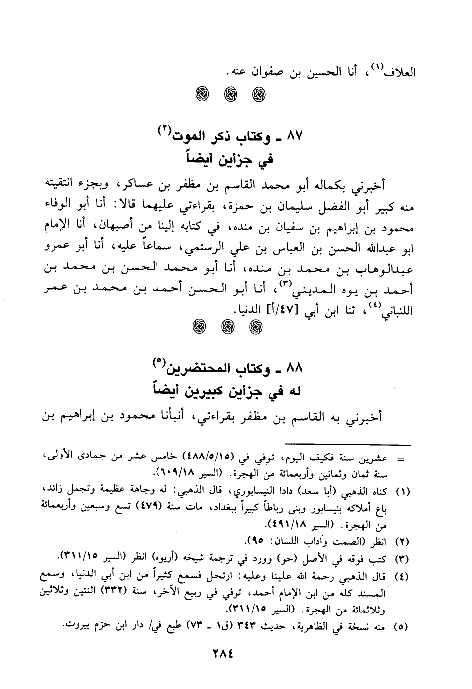 في جزأين أيضا أخبرني بكماله أَبُو مُحَمَّد الْقَاسِم بْن مظفر بْن عساكر، وبجزء انتقيته منه كبير أَبُو الفضل سليمان بْن حمزة، بِقِرَاءَتِي عليهما قالا: أنا أَبُو الوفاء محمود بْن إبراهيم بْن سفيان بْن منده، في كتابه إلينا من أصبهان، أنا الإمام أَبُو عَبْد اللَّه الحسن بْن العباس بْن علي الرستمي، سماعا عليه، أنا أَبُو عمرو عَبْد الوهاب بْن مُحَمَّد بْن منده، أنا أَبُو محمد الحسن بْن مُحَمَّد بْن أَحْمَد بْن يوه المديني، أنا أَبُو الحسن أَحْمَد بْن مُحَمَّد بْن عمر اللنباني، ثنا ابن أَبِي الدنيا