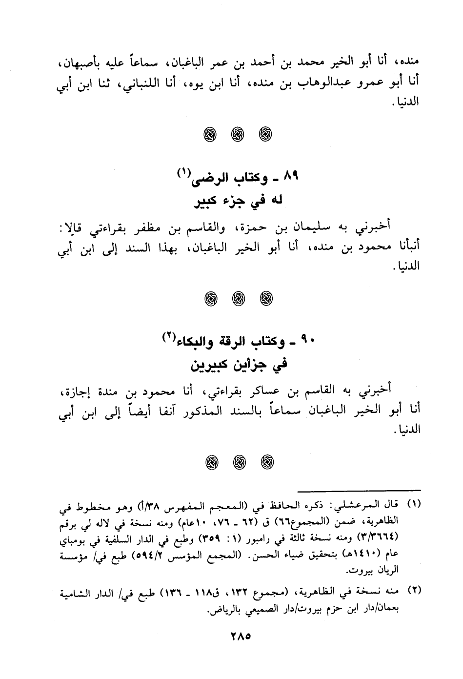 في جزأين كبيرين أخبرني به الْقَاسِم بْن عساكر بِقِرَاءَتِي، أنا محمود بْن منده إجازة، أنا أَبُو الخير الباغبان سماعا بالسند المذكور آنفا أيضا إلى ابن أَبِي الدنيا