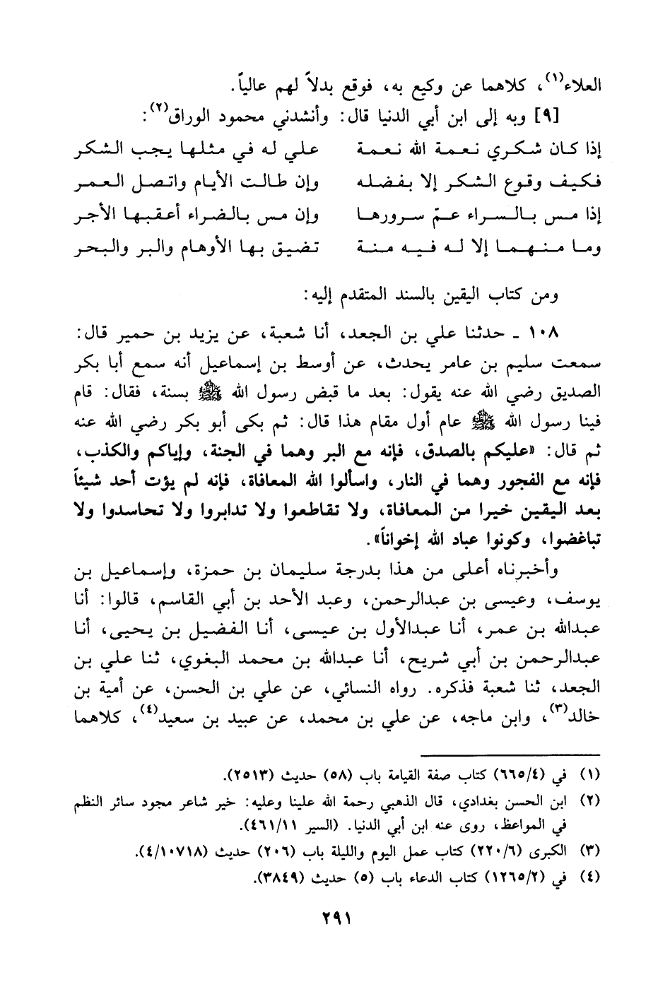108 - حَدَّثَنَا عَلِيُّ بْنُ الْجَعْدِ، أنا شُعْبَةُ، عَنْ يَزِيدَ بْنِ حُمَيْرٍ قَالَ: سَمِعْتُ سُلَيْمَ بْنَ عَامِرٍ يُحَدِّثُ، عَنْ أَوْسَطَ بْنِ إِسْمَاعِيلَ أَنَّهُ سَمِعَ أَبَا بَكْرٍ الصِّدِّيقَ رَضِيَ اللَّهُ عَنْهُ يَقُولُ: بَعْدَ مَا قُبِضَ رَسُولُ اللَّهِ صَلَّى اللَّهُ عَلَيْهِ وَسَلَّمَ بِسَنَةٍ، فَقَالَ: قَامَ فِينَا رَسُولُ اللَّهِ صَلَّى اللَّهُ عَلَيْهِ وَسَلَّمَ عَامَ أَوَّلَ مَقَامِي هَذَا قَالَ: ثُمَّ بَكَى أَبُو بَكْرٍ رَضِيَ اللَّهُ عَنْهُ ثُمَّ قَالَ: " عَلَيْكُمْ بِالصِّدْقِ، فَإِنَّهُ مَعَ الْبِرِّ وَهُمَا فِي الْجَنَّةِ، وَإِيَّاكُمْ وَالْكَذِبَ، فَإِنَّهُ مَعَ الْفُجُورِ وَهُمَا فِي النَّارِ، وَاسْأَلُوا اللَّهَ الْمُعَافَاةَ، فَإِنَّهُ لَمْ يُؤْتَ أَحَدٌ شَيْئًا بَعْدَ الْيَقِينِ خَيْرًا مِنَ الْمُعَافَاةِ، وَلا تَقَاطَعُوا وَلا تَدَابَرُوا وَلا تَحَاسَدُوا وَلا تَبَاغَضُوا، وَكُونُوا عِبَادَ اللَّهِ إِخْوَانًا " وَأَخْبَرَنَاهُ أَعْلَى مِنْ هَذَا بِدَرَجَةٍ سُلَيْمَانُ بْنُ حَمْزَةَ، وَإِسْمَاعِيلُ بْنُ يُوسُفَ، وَعِيسَى بْنُ عَبْدِ الرَّحْمَنِ، وَعَبْدُ الأَحَدِ بْنُ أَبِي الْقَاسِمِ، قَالُوا: أنا عَبْدُ اللَّهِ بْنُ عُمَرَ، أنا عَبْدُ الأَوَّلِ بْنُ عِيسَى، أنا الْفُضَيْلُ بْنُ يَحْيَى، أنا عَبْدُ الرَّحْمَنِ بْنُ أَبِي شُرَيْحٍ الْبَغَوِيُّ، ثنا عَلِيُّ بْنُ الْجَعْدِ، ثنا شُعْبَةُ فَذَكَرَهُ رَوَاهُ النَّسَائِيُّ، عَنْ عَلِيِّ بْنِ الْحَسَنِ، عَنْ أُمَيَّةَ بْنِ خَالِدٍ، وَابْنِ مَاجَهْ، عَنْ عَلِيِّ بْنِ مُحَمَّدٍ، عَنْ عُبَيْدِ بْنِ سَعِيدٍ، كِلاهُمَا