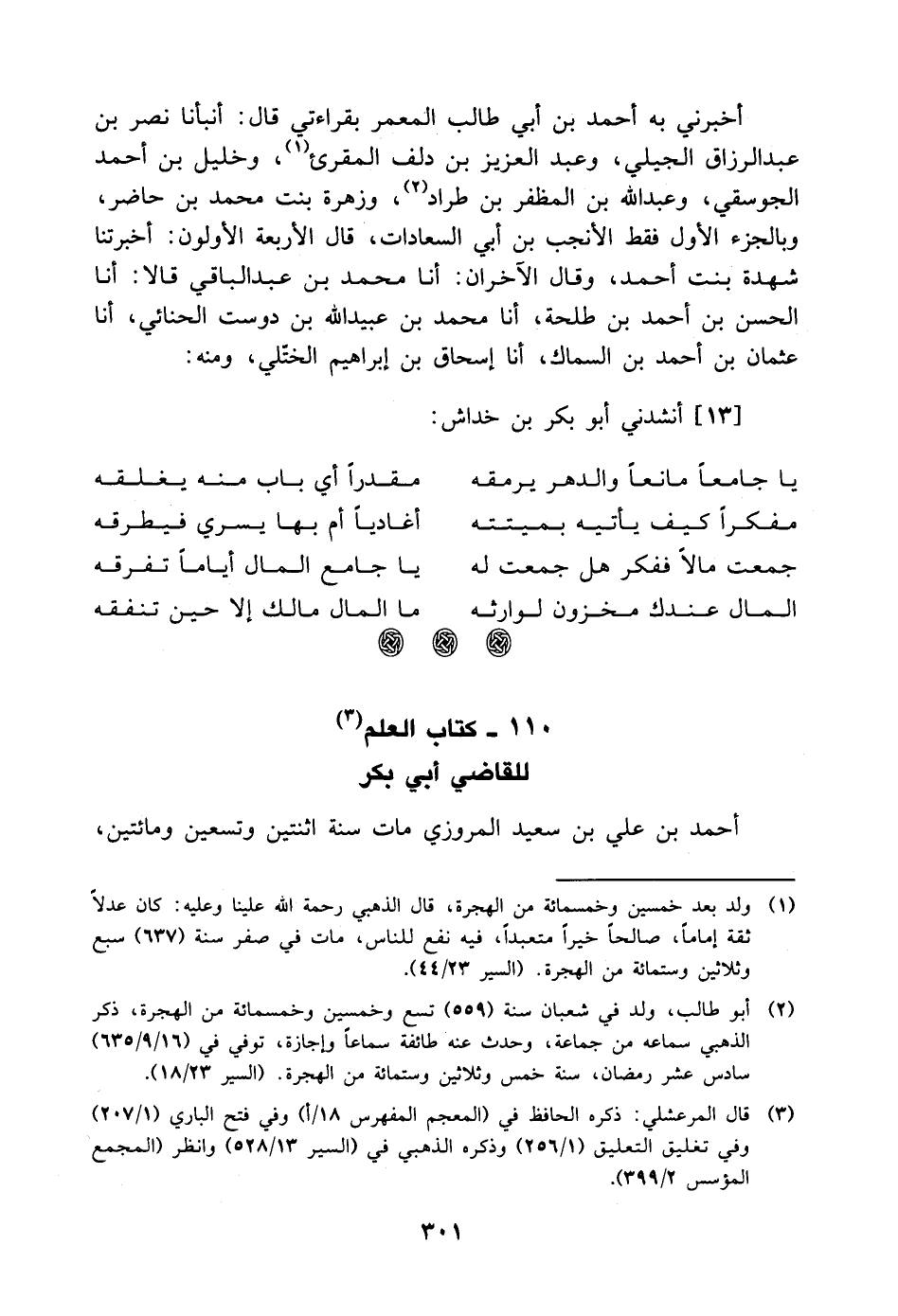 أخبرني به أَحْمَد بْن أَبِي طالب المعمر بِقِرَاءَتِي قَالَ: أنبأنا نصر بْن عَبْد الرزاق الجيلي، وعبد العزيز بْن دلف المقرئ، وخليل بْن أَحْمَد الجوسقي، وعبد اللَّه بْن المظفر بْن طراد، وزهرة بنت مُحَمَّد بْن حاضر، وبالجزء الأول فقط الأنجب بْن أَبِي السعادات، قَالَ الأربعة الأولون: أخبرتنا شهدة بنت أَحْمَد، وقال الآخران: أنا محمد بْن عَبْد الباقي قالا: أنا الحسن بْن أَحْمَد بْن طلحة، أنا محمد بْن عبيد اللَّه بْن دوست الحنائي، أنا عثمان بْن أَحْمَد بْن السماك، أنا إسحاق بْن إبراهيم الختلي، ومنه: