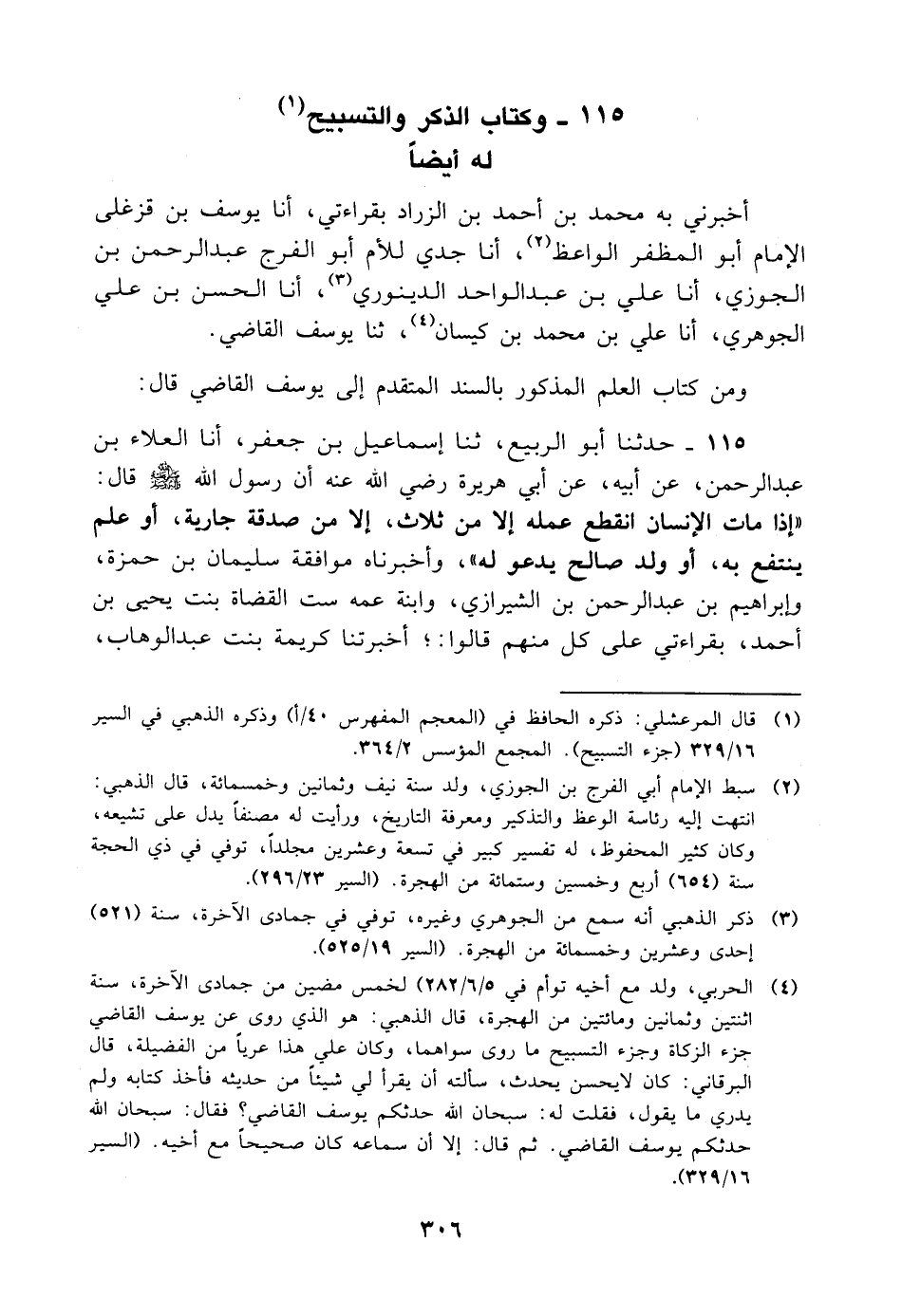 له أيضا أخبرني به مُحَمَّد بْن أَحْمَد بْن الزراد بِقِرَاءَتِي، أنا يوسف بْن قزغلى الإمام أَبُو المظفر الواعظ، أنا جدي للأم أَبُو الفرج عَبْد الرحمن بْن الجوزي، أنا علي بْن عَبْد الواحد الدينوي، أنا الحسن بْن علي الجوهري، أنا علي بْن مُحَمَّد بْن كيسان، ثنا يوسف القاضي ومن كتاب العلم المذكور بالسند المتقدم إلى يوسف القاضي قَالَ: