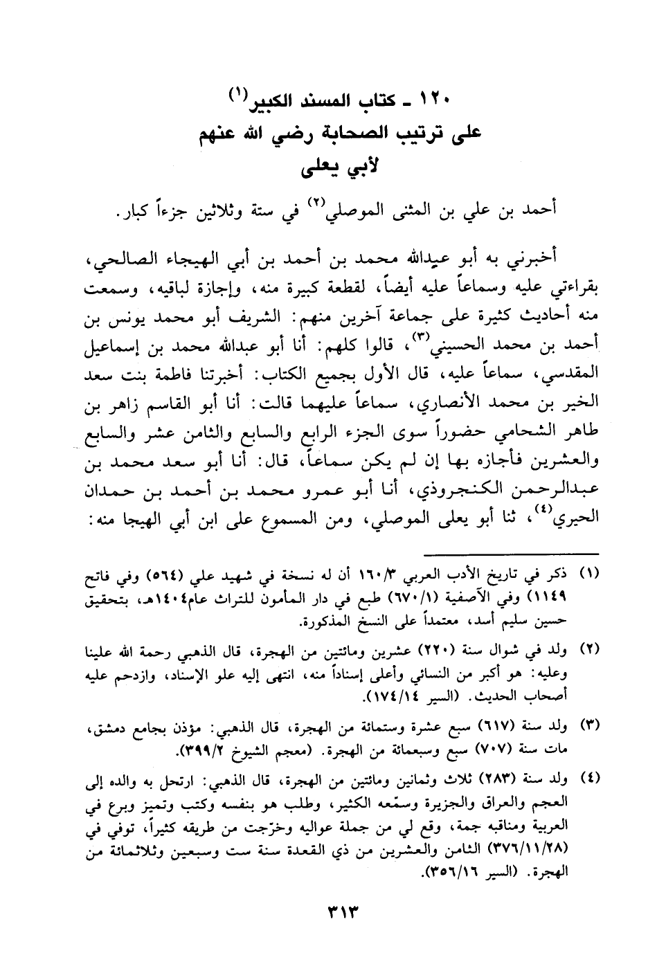 أحمد بْن علي بْن المثنى الموصلي في ستة وثلاثين جزءا كبار أخبرني به أَبُو عَبْد اللَّه مُحَمَّد بْن أَحْمَد بْن أَبِي الهيجاء الصالحي، بِقِرَاءَتِي عليه وسماعا عليه أيضا، لقطعة كبيرة منه، وإجازة لباقيه، وسمعت منه أحاديث كثيرة على جماعة آخرين منهم: الشريف أَبُو مُحَمَّد يونس بْن أَحْمَد بْن مُحَمَّد الحسيني، قالوا كلهم: أنا أَبُو عَبْد اللَّه محمد بْن إسماعيل الْمَقْدِسِيّ، سماعا عليه، قَالَ الأول بجميع الكتاب: أخبرتنا فاطمة بنت سعد الخير بْن مُحَمَّد الأنصاري، سماعا عليهما قالت: أنا أَبُو الْقَاسِم زاهر بْن طاهر الشحامي حضورا سوى الجزء الرابع والسابع والثامن عشر والسابع والعشرين فأجازه بها إن لم يكن سماعا، قَالَ: أنا أَبُو سعد مُحَمَّد بْن عَبْد الرحمن الكنجروذي، أنا أَبُو عمرو مُحَمَّد بْن أَحْمَد بْن حمدان الحيري، ثنا أَبُو يعلى الموصلي، ومن المسموع على ابن أَبِي الهيجا منه: