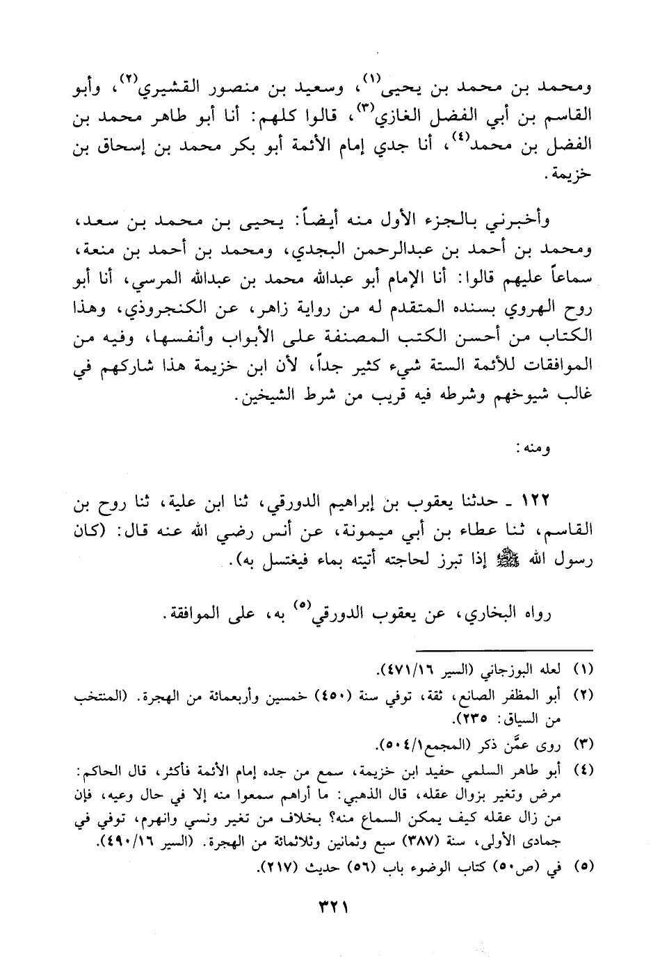 ومحمد بْن مُحَمَّد بْن يحيى، وسعيد بْن منصور القشيري، وأبو الْقَاسِم بْن أَبِي الفضل الغازي، قالوا كلهم: أنا أَبُو طاهر مُحَمَّد بْن الفضل بْن مُحَمَّد، أنا جدي إمام الأئمة أَبُو بكر مُحَمَّد بْن إسحاق بْن خزيمة وأخبرني بالجزء الأول منه أيضا: يحيى بْن مُحَمَّد بْن سعد، ومحمد بْن أَحْمَد بْن عَبْد الرحمن البجدي، ومحمد بْن أَحْمَد بْن منعة، سماعا عليهم قالوا: أنا الإمام أَبُو عَبْد اللَّه مُحَمَّد بْن عَبْد اللَّه المرسي، أنا أَبُو روح الهروي بسنده المتقدم له من رواية زاهر، عن الكنجروذي، وهذا الكتاب من أحسن الكتب المصنفة على الأبواب وأنفسها، وفيه من الموافقات للأئمة الستة شيء كثير
