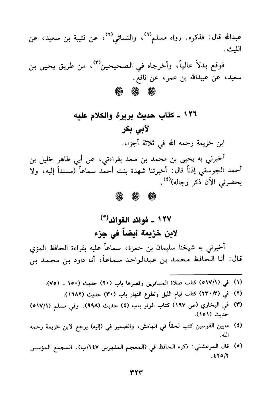 ابن خزيمة رحمه اللَّه في ثلاثة أجزاء أخبرني به يحيى بْن مُحَمَّد بْن سعد بِقِرَاءَتِي، عن أَبِي طاهر خليل بْن أَحْمَد الجوسقي إذنا قَالَ: أخبرتنا شهدة بنت أَحْمَد سماعا مسندا إليه، ولا يحضرني الآن ذكر رجاله