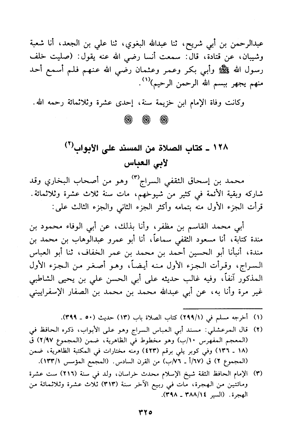 عَبْدُ الرَّحْمَنِ بْنُ أَبِي شُرَيْحٍ، ثنا عَبْدُ اللَّهِ الْبَغَوِيُّ، ثنا عَلِيُّ بْنُ الْجَعْدِ، أنا شُعْبَةُ، وَشَيْبَانُ، عَنْ قَتَادَةَ، قَالَ: سَمِعْتُ أَنَسًا رَضِيَ اللَّهُ عَنْهُ يَقُولُ: " صَلَّيْتُ خَلْفَ رَسُولِ اللَّهِ صَلَّى اللَّهُ عَلَيْهِ وَسَلَّمَ وَأَبِي بَكْرٍ وَعُمَرَ وَعُثْمَانَ رَضِيَ اللَّهُ عَنْهُمْ فَلَمْ أَسْمَعْ أَحَدًا مِنْهُمْ يَجْهَرُ بِبِسْمِ اللَّهِ الرَّحْمَنِ الرَّحِيمِ " وكانت وفاة الإمام ابن خزيمة سنة، إحدى عشرة وثلاث مائة رحمه اللَّه