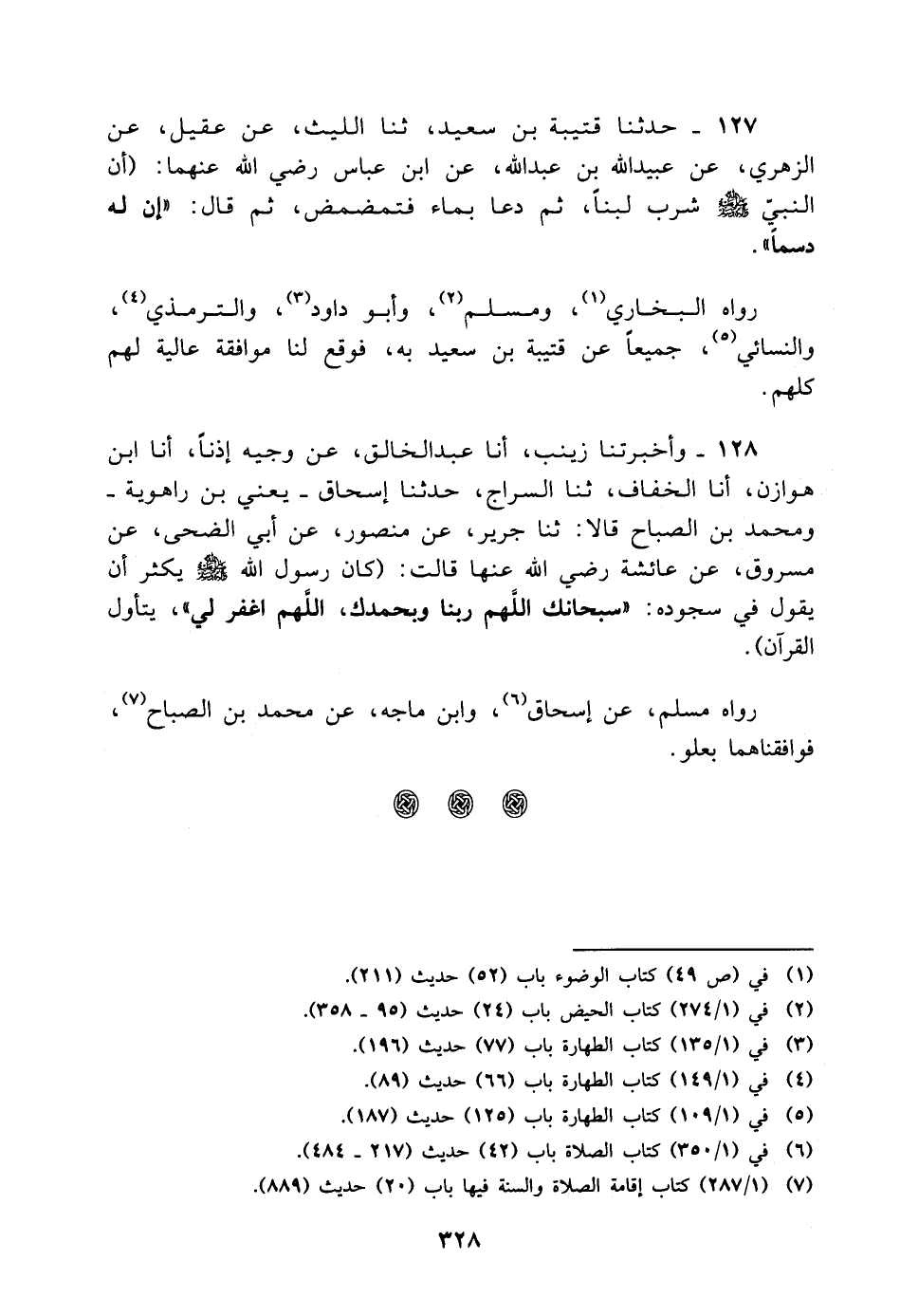 127 -حَدَّثَنَا قُتَيْبَةُ بْنُ سَعِيدٍ، ثنا اللَّيْثُ، عَنْ عَقِيلٍ، عَنِ الزُّهْرِيِّ، عَنْ عُبَيْدِ اللَّهِ بْنِ عَبْدِ اللَّهِ، عَنِ ابْنِ عَبَّاسٍ رَضِيَ اللَّهُ عَنْهُمَا: " أَنَّ النَّبِيَّ صَلَّى اللَّهُ عَلَيْهِ وَسَلَّمَ شَرِبَ لَبَنًا، ثُمَّ دَعَا بِمَاءٍ فَتَمَضْمَضَ، ثُمَّ قَالَ: إِنَّ لَهُ دَسَمًا "، رَوَاهُ الْبُخَارِيُّ، وَمُسْلِمٌ، وَأَبُو دَاوُدَ، وَالتِّرْمِذِيُّ، وَالنَّسَائِيُّ، جَمِيعًا عَنْ قُتَيْبَةَ بْنِ سَعِيدٍ بِهِ، فَوَقَعَ لَنَا مُوَافَقَةً عَالِيَةً لَهُمْ كُلِّهِمْ