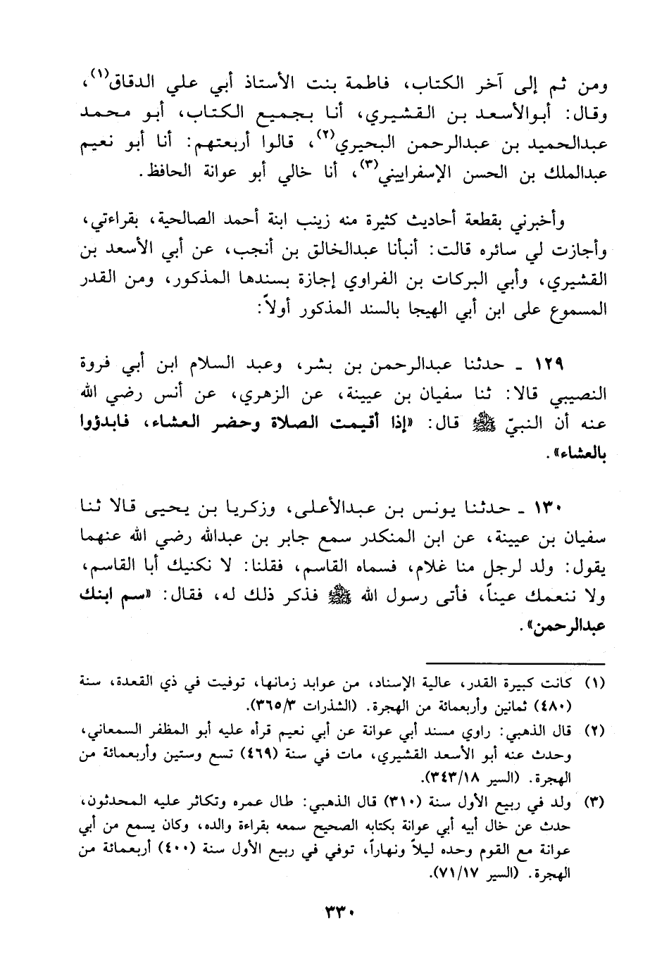 ومن ثم إلى آخر الكتاب، فاطمة بنت الأستاذ أَبِي علي الدقاق، وقال: أَبُو الأسعد بْن القشيري، أنا بجميع الكتاب، أَبُو مُحَمَّد عَبْد الحميد بْن عَبْد الرحمن البحيري، قالوا أربعتهم: أنا أَبُو نعيم عَبْد الملك بْن الحسن الإسفراييني، أنا خالي أَبُو عوانة الحافظ وأخبرني بقطعة أحاديث كثيرة منه زينب ابنة أَحْمَد الصالحية، بِقِرَاءَتِي، وأجازت لي سائره قالت: