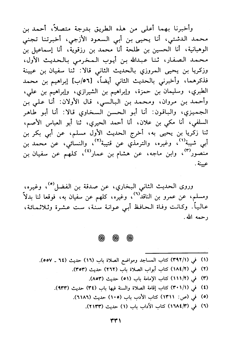 ، وإبراهيم بْن الشيرازي، وإبراهيم بْن علي، وأحمد بْن مروان، ومحمد بْن البالسي، قَالَ الأولان: أنا علي بْن الجميزي، والباقون: أنا أَبُو الحسن السخاوي قالا: أنا أَبُو طاهر السلفي، أنا مكي بْن علان، أنا أحمد الحيري، ثنا أَبُو العباس الأصم، ثنا زكريا بْن يحيى به، أخرج الحديث الأول مسلم، عن أَبِي بكر بْن أَبِي شيبة، وغيره، والتِّرْمِذِيّ، عن قتيبة، والنسائي، عن مُحَمَّد بْن منصور، وابن ماجه، عن هشام بْن عمار، كلهم عن سفيان بْن عيينة وروى الحديث الثاني البخاري، عن صدقة بْن الفضل، وغيره، ومسلم، عن عمرو بْن الناقد، وغيره، كلهم عن سفيان به، فوقعا لنا بدلا عاليا وكانت وفاة الحافظ أَبِي عوانة سنة، ست عشرة وثلاث مائة، رحمه اللَّه