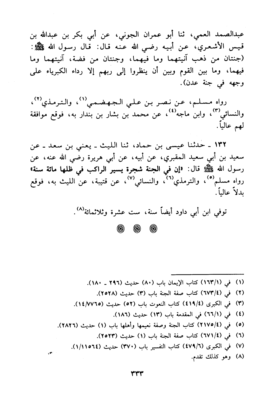 132 - حَدَّثَنَا عِيسَى بْنُ حَمَّادٍ، ثنا اللَّيْثُ يَعْنِي ابْنَ سَعْدٍ، عَنْ سَعِيدِ بْنِ أَبِي سَعِيدٍ الْمَقْبُرِيِّ، عَنْ أَبِيهِ، عَنْ أَبِي هُرَيْرَةَ رَضِيَ اللَّهُ عَنْهُ، عَنْ رَسُولِ اللَّهِ صَلَّى اللَّهُ عَلَيْهِ وَسَلَّمَ قَالَ: " إِنَّ فِي الْجَنَّةِ شَجَرَةً يَسِيرُ الرَّاكِبُ فِي ظِلِّهَا مِائَةَ سَنَةٍ " رَوَاهُ مُسْلِمٌ، وَالتِّرْمِذِيُّ، وَالنَّسَائِيُّ، عَنْ قُتَيْبَةَ، عَنِ اللَّيْثِ بِهِ، فَوَقَعَ بَدَلا عَالِيًا توفي ابن أَبِي داود أيضا سنة، عشرة وثلاث مائة