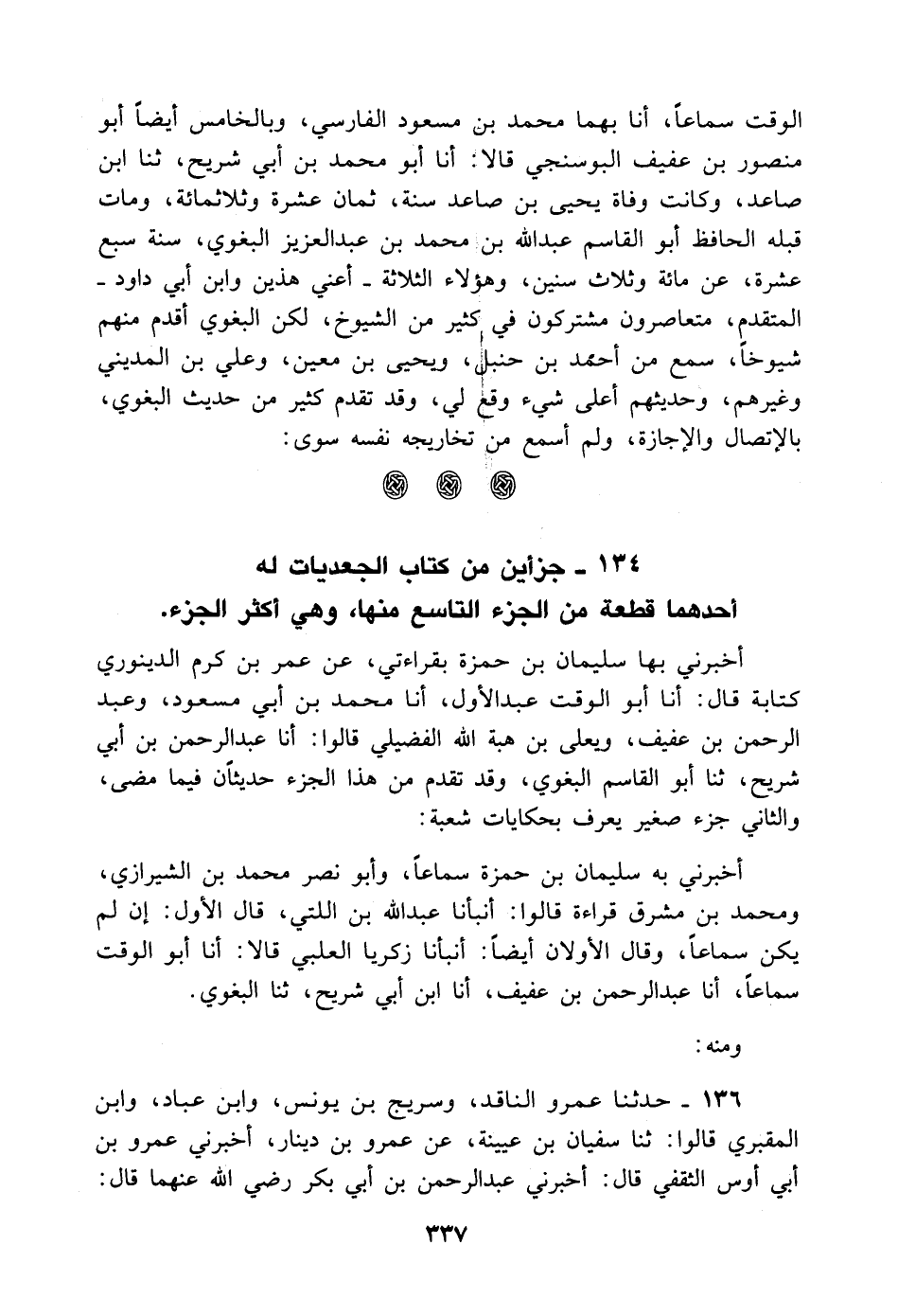 له أحدهما قطعة من الجزء التاسع منها، وهي أكثر الجزء أخبرني بهما سليمان بْن حمزة بِقِرَاءَتِي، عن عمر بْن كرم الدينوي كتابة قَالَ: أنا أَبُو الوقت عَبْد الأول، أنا محمد بْن أَبِي مسعود، وعبد الرحمن بْن عفيف، ويعلى بْن هبة اللَّه الفضيلي قالوا: أنا عَبْد الرحمن بْن أَبِي شريح، ثنا أَبُو الْقَاسِم البغوي، وقد تقدم من هذا الجزء حديثان فيما مضى، والثاني جزء صغير يعرف بحكايات شعبة: أخبرني به سليمان بْن حمزة سماعا، وأبو نصر مُحَمَّد بْن الشيرازي، ومحمد بْن مشرق قراءة قالوا: أنبأنا عَبْد اللَّه بْن اللتي، قَالَ الأول: إن لم يكن سماعا، وقال الأولان أيضا: أنبأنا زكريا العلبي قالا: أنا أَبُو الوقت سماعا، أنا عَبْد الرحمن بْن عفيف، أنا ابن أَبِي شريح، ثنا البغوي ومنه: