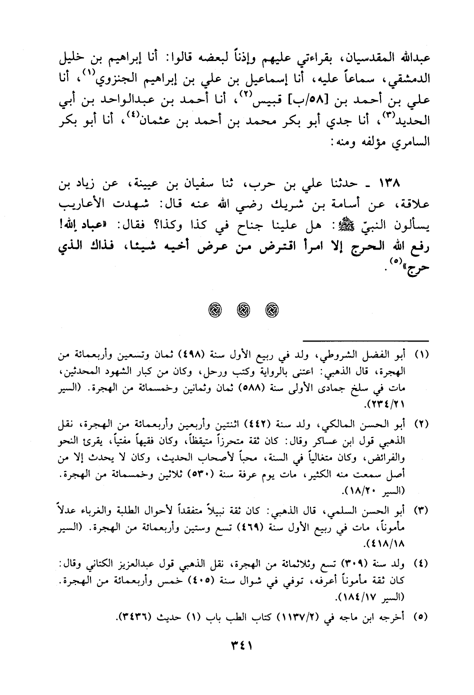 عَبْد اللَّه الْمَقْدِسِيّان، بِقِرَاءَتِي عليهم وإذنا لبعضه قالوا: أنا إبراهيم بْن خليل الدمشقي، سماعا عليه، أنا إسماعيل بْن علي بْن إبراهيم الجنزوي، أنا علي بْن أَحْمَد بْن قبيس، أنا أحمد بْن عَبْد الواحد بْن أَبِي الحديد، أنا جدي أَبُو بكر مُحَمَّد بْن أَحْمَد بْن عثمان، أنا أَبُو بكر السامري مؤلفه ومنه: