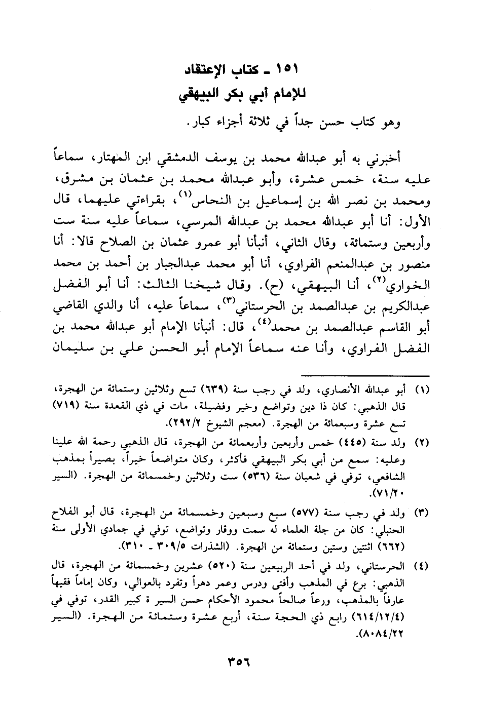وهو كتاب حسن جدا في ثلاثة أجزاء كبار أخبرني به أَبُو عَبْد اللَّه مُحَمَّد بْن يوسف الدمشقي بْن المهتار، سماعا عليه سنة، خمس عشرة، وأبو عَبْد اللَّه مُحَمَّد بْن عثمان بْن مشرق، ومحمد بْن نصر اللَّه بْن إسماعيل بْن النحاس، بِقِرَاءَتِي عليهما، قَالَ الأول: أنا أَبُو عَبْد اللَّه محمد بْن عَبْد اللَّه المرسي، سماعا عليه سنة ست وأربعين وست مائة، وقال الثاني: أنبأنا أَبُو عمرو عثمان بْن الصلاح قالا: أنا منصور بْن عَبْد المنعم الفراوي، أنا أَبُو محمد عَبْد الجبار بْن أَحْمَد بْن مُحَمَّد الخواري، أنا البيهقي، ح وقال شيخنا الثالث: أنا أَبُو الفضل عَبْد الكريم بْن عَبْد الصمد بْن الحرستاني، سماعا عليه، أنا والدي القاضي أَبُو الْقَاسِم عَبْد الصمد بْن مُحَمَّد، قَالَ: أنبأنا أَبُو عَبْد اللَّه مُحَمَّد بْن الفضل الفراوي، وأنا عنه سماعا الإمام أَبُو الحسن علي بْن سليمان