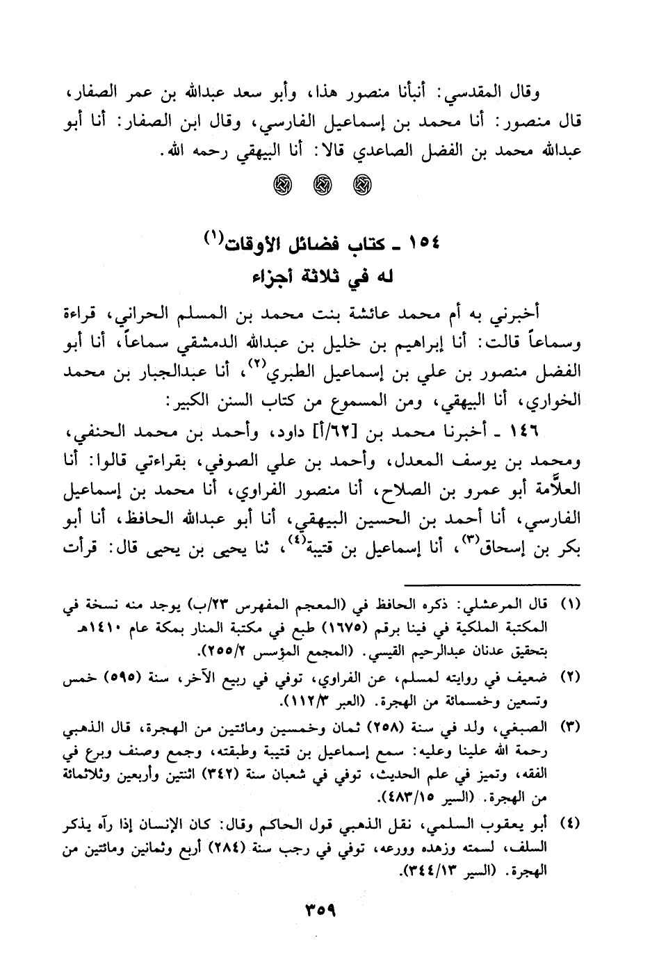 وقال الْمَقْدِسِيّ: أنبأنا منصور هذا، وأبو سعد عَبْد اللَّه بْن عمر الصفار، قَالَ منصور: أنا محمد بْن إسماعيل الفارسي، وقال ابن الصفار: أنا أَبُو عَبْد اللَّه محمد بْن الفضل الصاعدي قالا: أنا البيهقي رحمه اللَّه