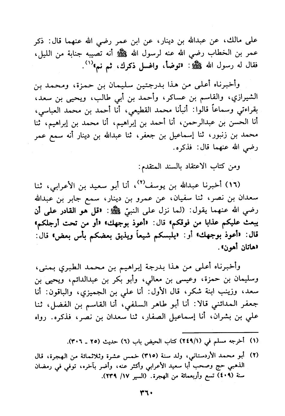 عَلَى مَالِكٍ، عَنْ عَبْدِ اللَّهِ بْنِ دِينَارٍ، عَنِ ابْنِ عُمَرَ رَضِيَ اللَّهُ عَنْهُمَا قَالَ: ذَكَرَ عُمَرُ بْنُ الْخَطَّابِ رَضِيَ اللَّهُ عَنْهُ لِرَسُولِ اللَّهِ صَلَّى اللَّهُ عَلَيْهِ وَسَلَّمَ أَنَّهُ تُصِيبُهُ جَنَابَةٌ مِنَ اللَّيْلِ، فَقَالَ لَهُ رَسُولُ اللَّهِ صَلَّى اللَّهُ عَلَيْهِ وَسَلَّمَ: " تَوَضَّأْ، وَاغْسِلْ ذَكَرَكَ، ثُمَّ نَمْ " وَأَخْبَرَنَاهُ أَعْلَى مِنْ هَذَا بِدَرَجَتَيْنِ سُلَيْمَانُ بْنُ حَمْزَةَ، وَمُحَمَّدُ بْنُ الشِّيرَازِيِّ، وَالْقَاسِمُ بْنُ عَسَاكِرَ، وَأَحْمَدُ بْنُ أَبِي طَالِبٍ، وَيَحْيَى بْنُ سَعْدٍ، بِقِرَاءَتِي وَسَمَاعًا قَالُوا: أَنْبَأَنَا مُحَمَّدٌ الْقَطِيعِيُّ، أنا أَحْمَدُ بْنُ مُحَمَّدٍ الْعَبَّاسِيُّ، أنا الْحَسَنُ بْنُ عَبْدِ الرَّحْمَنِ، أنا أَحْمَدُ بْنُ إِبْرَاهِيمَ، أنا مُحَمَّدُ بْنُ إِبْرَاهِيمَ، ثنا مُحَمَّدُ بْنُ زُنْبُورٍ، ثنا إِسْمَاعِيلُ بْنُ جَعْفَرٍ، ثنا عَبْدُ اللَّهِ بْنُ دِينَارٍ أَنَّهُ سَمِعَ ابْنَ عُمَرَ رَضِيَ اللَّهُ عَنْهُمَا قَالَ: فَذَكَرَهُ ومن كتاب الاعتقاد بالسند المتقدم: