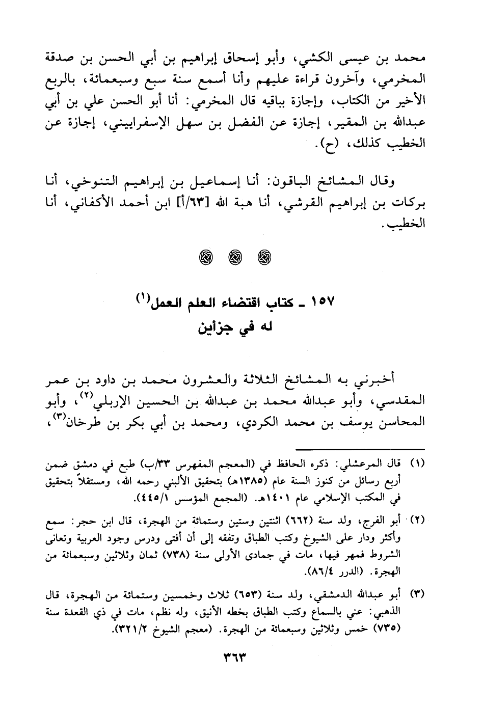 مُحَمَّد بْن عيسى الكشي، وأبو إسحاق إبراهيم بْن أَبِي الحسن بْن صدقة المخرمي، وآخرون قراءة عليهم وأنا أسمع سنة سبع وسبع مائة، بالربع الأخير من الكتاب، وإجازة بباقيه قَالَ المخرمي: أنا أَبُو الحسن علي بْن أَبِي عَبْد اللَّه بْن المقير، إجازة عن الفضل بْن سهل الإسفراييني، إجازة عن الخطيب كذلك، ح وقال المشايخ الباقون: أنا إسماعيل بْن إبراهيم التنوخي، أنا بركات بْن إبراهيم القرشي، أنا هبة اللَّه بْن أَحْمَد الأكفاني، أنا الخطيب