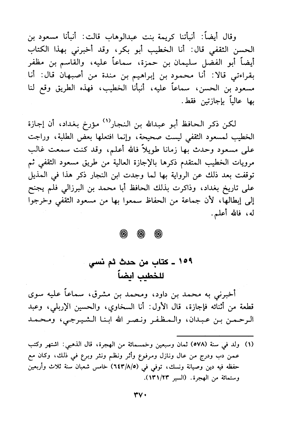 وقال أيضا: أنبأتنا كريمة بنت عَبْد الوهاب قالت: أنبأنا مسعود بْن الحسن الثقفي قَالَ: أنا الخطيب أَبُو بكر، وقد أخبرني بهذا الكتاب أيضا أَبُو الفضل سليمان بْن حمزة، سماعا عليه، والقاسم بْن مظفر بِقِرَاءَتِي قالا: أنا محمود بْن إبراهيم بْن منده من أصبهان قَالَ: أنا مسعود بْن الحسن، سماعا عليه، أنبأنا الخطيب، فهذه الطريق وقع لنا بها عاليا بإجازتين فقط لكن ذكر الحافظ أَبُو عَبْد اللَّه بْن النجار، مؤرخ بغداد، أن إجازة الخطيب لمسعود الثقفي ليست صحيحة، وإنما افتعلها بعض الطلبة، وراجت