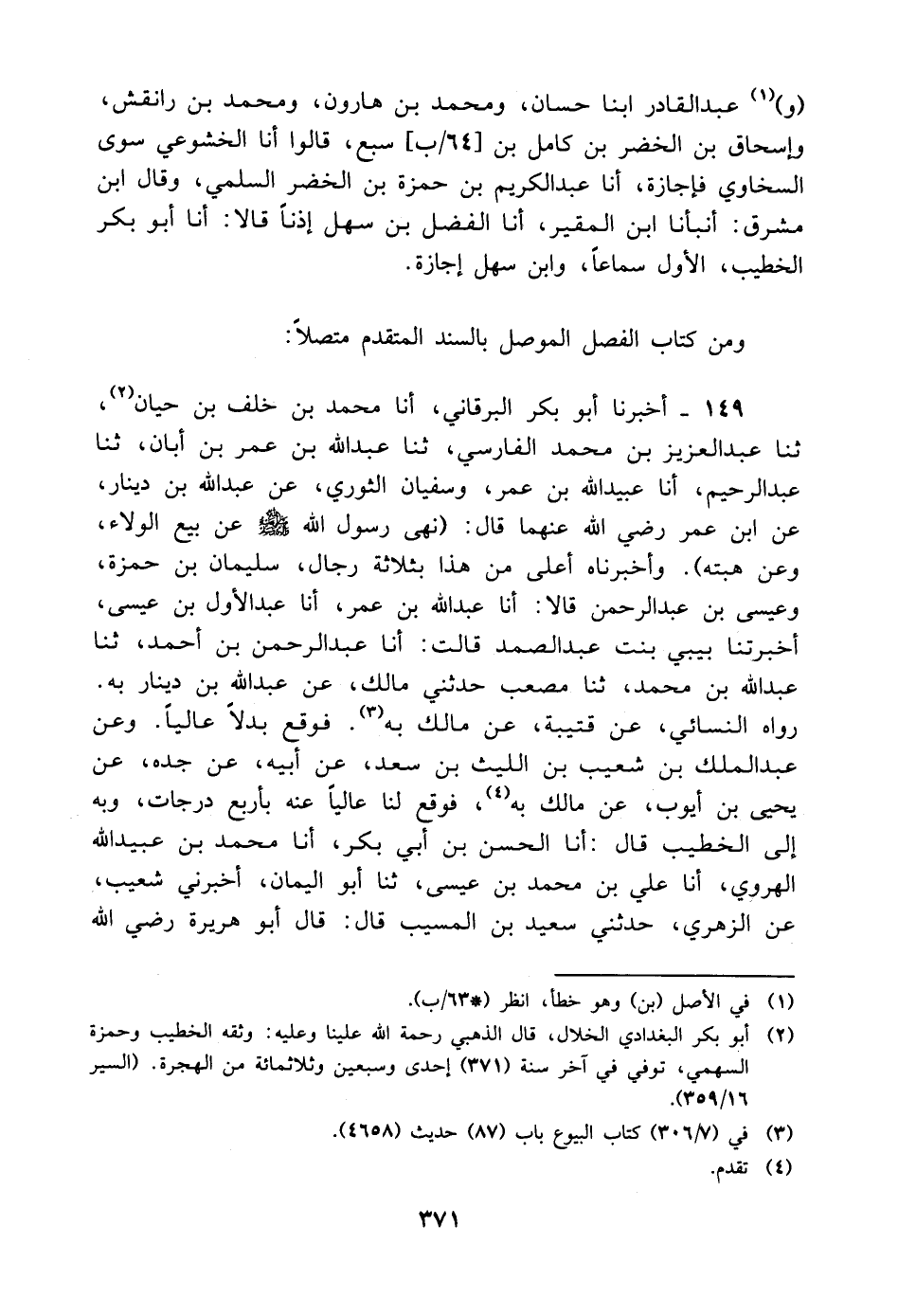 149 - أَخْبَرَنَا أَبُو بَكْرٍ الْبَرْقَانِيُّ، أنا مُحَمَّدُ بْنُ خَلَفِ بْنِ حَيَّانَ، ثنا عَبْدُ الْعَزِيزِ بْنُ مُحَمَّدٍ الْفَارِسِيُّ، ثنا عَبْدُ اللَّهِ بْنُ عُمَرَ بْنِ أَبَانٍ، ثنا عَبْدُ الرَّحِيمِ، أنا عُبَيْدُ اللَّهِ بْنُ عُمَرَ، وَسُفْيَانُ الثَّوْرِيُّ، عَنْ عَبْدِ اللَّهِ بْنِ دِينَارٍ، عَنِ ابْنِ عُمَرَ رَضِيَ اللَّهُ عَنْهُمَا قَالَ: " نَهَى رَسُولُ اللَّهِ صَلَّى اللَّهُ عَلَيْهِ وَسَلَّمَ عَنْ بَيْعِ الْوَلاءِ، وَعَنْ هِبَتِهِ " وَأَخْبَرَنَاهُ أَعْلَى مِنْ هَذَا بِثَلاثَةِ رِجَالٍ، سُلَيْمَانُ بْنُ حَمْزَةَ، وَعِيسَى بْنُ عَبْدِ الرَّحْمَنِ قَالا: أنا عَبْدُ اللَّهِ بْنُ عُمَرَ، أنا عَبْدُ الأَوَّلِ بْنُ عِيسَى، أَخْبَرَتْنَا بِيبِي بِنْتُ عَبْدِ الصَّمَدِ قَالَتْ: أنا عَبْدُ الرَّحْمَنِ بْنُ أَحْمَدَ، ثنا عَبْدُ اللَّهِ بْنُ مُحَمَّدٍ، ثنا مُصْعَبٍ، حَدَّثَنِي مَالِكٌ، عَنْ عَبْدِ اللَّهِ بْنِ دِينَارٍ بِهِ رَوَاهُ النَّسَائِيُّ، عَنْ قُتَيْبَةَ، عَنْ مَالِكٍ بِهِ فَوَقَعَ بَدَلا عَالِيًا وَعَنْ عَبْدِ الْمَلِكِ بْنِ شُعَيْبِ بْنِ اللَّيْثِ بْنِ سَعْدٍ، عَنْ أَبِيهِ، عَنْ جَدِّهِ، عَنْ يَحْيَى بْنِ أَيُّوبَ، عَنْ مَالِكٍ بِهِ، فَوَقَعَ لَنَا عَالِيًا عَنْهُ بِأَرْبَعِ دَرَجَاتٍ