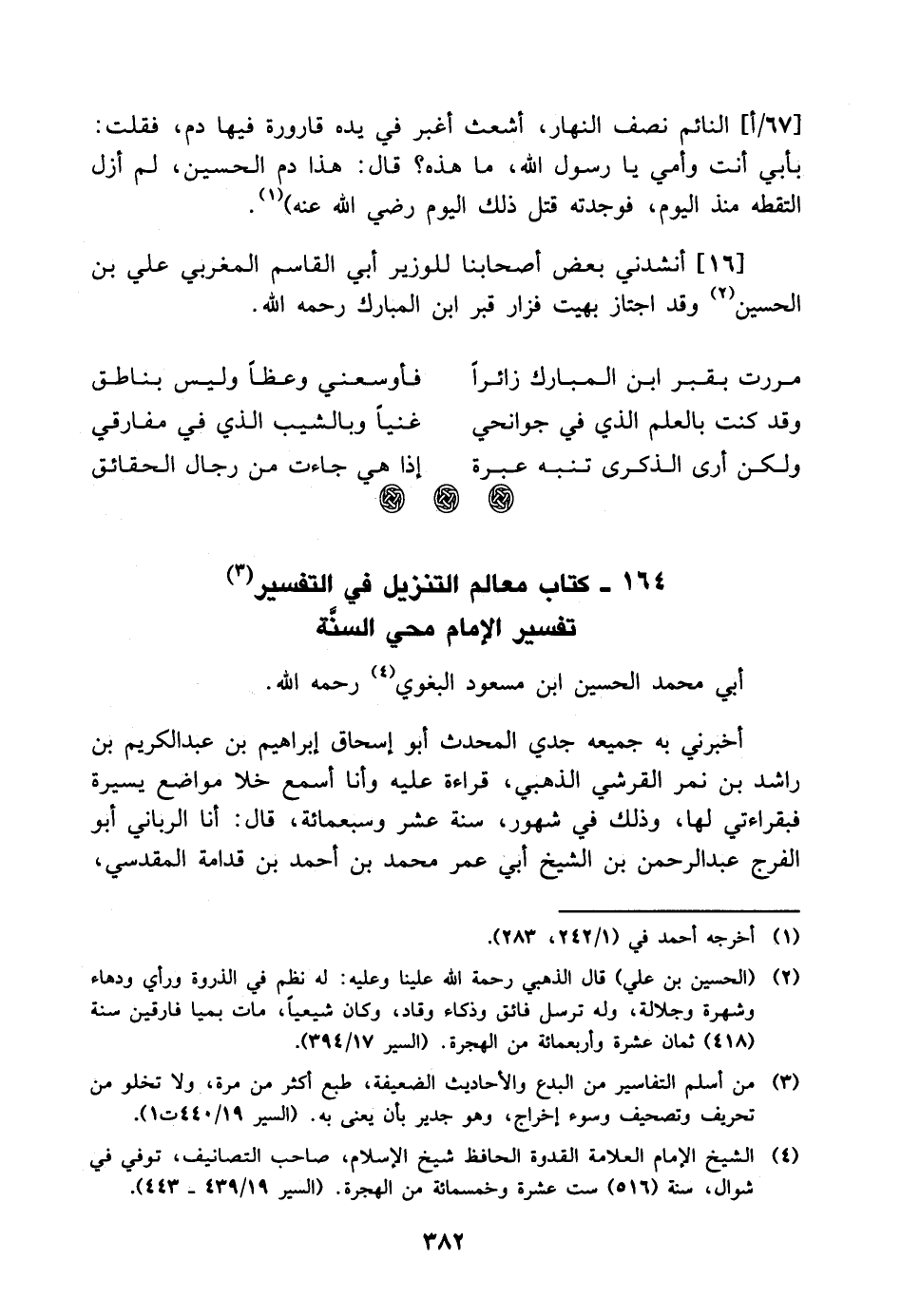 أبي مُحَمَّد الحسين بْن مسعود البغوي رحمه اللَّه أخبرني به جميعه جدي المحدث أَبُو إسحاق إبراهيم بْن عَبْد الكريم بْن راشد بْن نمر القرشي الذهبي، قراءة عليه وأنا أسمع خلا مواضع يسيرة فبِقِرَاءَتِي لها، وذلك في شهور، سنة عشر وسبع مائة، قَالَ: أنا الرباني أَبُو الفرج عَبْد الرحمن بْن الشيخ أَبِي عمر مُحَمَّد بْن أَحْمَد بْن قدامة الْمَقْدِسِيّ،