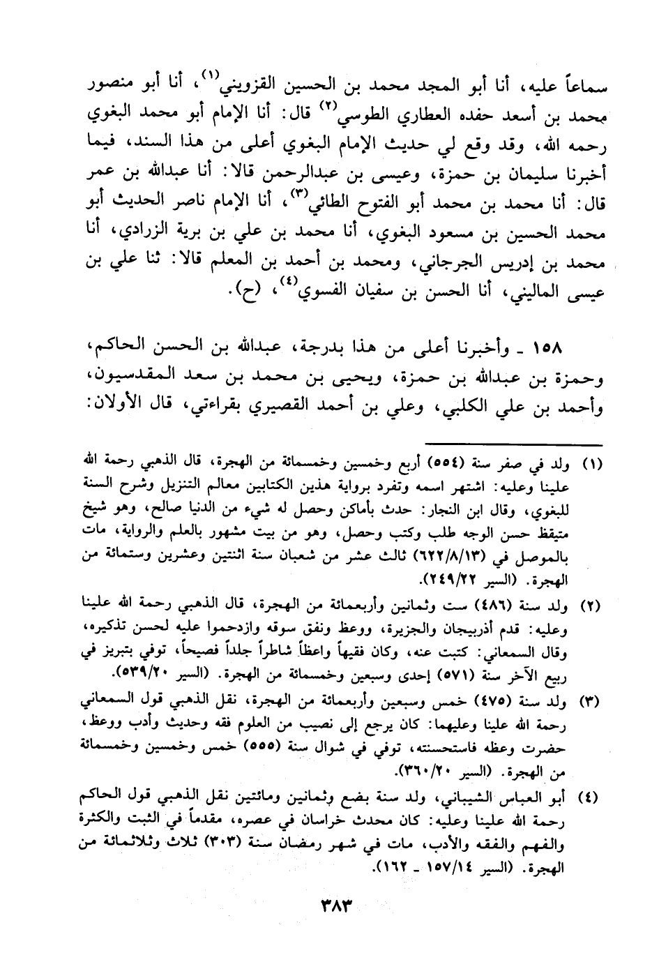 سماعا عليه، أنا أَبُو المجد مُحَمَّد بْن الحسين القزويني، أنا أَبُو منصور مُحَمَّد بْن أسعد حفدة العطاري الطوسي قَالَ: أنا الإمام أَبُو مُحَمَّد البغوي رحمه اللَّه، وقد وقع لي حديث الإمام البغوي أعلى من هذا السند، فيما أَخْبَرَنَا سليمان بْن حمزة، وعيسى بْن عَبْد الرحمن قالا: أنا عَبْد اللَّه بْن عمر قَالَ: أنا محمد بْن مُحَمَّد أَبُو الفتوح الطائي، أنا الإمام ناصر الحديث أَبُو مُحَمَّد الحسين بْن مسعود البغوي، أنا محمد بْن علي بْن برية الزرادي، أنا محمد بْن إدريس الجرجاني، ومحمد بْن أَحْمَد بْن المعلم قالا: ثنا علي بْن عيسى الماليني، أنا الحسن بْن سفيان الفسوي، ح