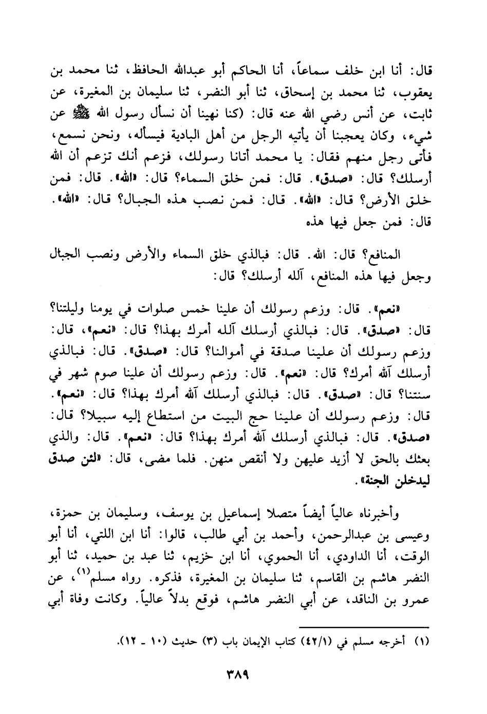 قَالَ: أنا ابْنُ خَلَفٍ سَمَاعًا، أنا الْحَاكِمُ أَبُو عَبْدِ اللَّهِ الْحَافِظُ، ثنا مُحَمَّدُ بْنُ يَعْقُوبَ، ثنا مُحَمَّدُ بْنُ إِسْحَاقَ، ثنا أَبُو النَّضْرِ، ثنا سُلَيْمَانُ بْنُ الْمُغِيرَةِ، عَنْ ثَابِتٍ، عَنْ أَنَسٍ رَضِيَ اللَّهُ عَنْهُ قَالَ: " كُنَّا نُهِينَا أَنْ نَسْأَلَ رَسُولَ اللَّهِ صَلَّى اللَّهُ عَلَيْهِ وَسَلَّمَ عَنْ شَيْءٍ، وَكَانَ يُعْجِبُنَا أَنْ يَأْتِيَهُ الرَّجُلُ مِنْ أَهْلِ الْبَادِيَةِ فَيَسْأَلَهُ، وَنَحْنُ نَسْمَعُ، فَأَتَى رَجُلٌ مِنْهُمْ فَقَالَ: يَا مُحَمَّدُ أَتَانَا رَسُولُكَ، فَزَعَمَ أَنَّكَ تَزْعُمُ أَنَّ اللَّهَ أَرْسَلَكَ؟ قَالَ: صَدَقَ قَالَ: فَمَنْ خَلَقَ السَّمَاءَ؟ قَالَ: اللَّهُ قَالَ: فَمَنْ خَلَقَ الأَرْضَ؟ قَالَ: اللَّهُ قَالَ: فَمَنْ نَصَبَ هَذِهِ الْجِبَالَ؟ قَالَ: اللَّهُ قَالَ: فَمَنْ جَعَلَ فِيهَا هَذِهِ الْمَنَافِعَ؟ قَالَ: اللَّهُ قَالَ: فَبِالَّذِي خَلَقَ السَّمَاءَ وَالأَرْضَ وَنَصَبَ الْجِبَالَ وَجَعَلَ فِيهَا هَذِهِ الْمَنَافِعَ، آللَّهُ أَرْسَلَكَ؟ قَالَ: نَعَمْ قَالَ: وَزَعَمَ رَسُولُكَ أَنَّ عَلَيْنَا خَمْسَ صَلَوَاتٍ فِي يَوْمِنَا وَلَيْلَتِنَا؟ قَالَ: صَدَقَ قَالَ: فَبِالَّذِي أَرْسَلَكَ آللَّهُ أَمَرَكَ بِهَذَا؟ قَالَ: نَعَمْ قَالَ: وَزَعَمَ رَسُولُكَ أَنَّ عَلَيْنَا صَدَقَةً فِي أَمْوَالِنَا؟ قَالَ: صَدَقَ قَالَ: فَبِالَّذِي أَرْسَلَكَ آللَّهُ أَمَرَكَ؟ قَالَ: نَعَمْ قَالَ: وَزَعَمَ رَسُولُكَ أَنَّ عَلَيْنَا صَوْمَ شَهْرٍ فِي سَنَتِنَا؟ قَالَ: صَدَقَ قَالَ: فَبِالَّذِي أَرْسَلَكَ آللَّهُ أَمَرَكَ بِهَذَا؟ قَالَ: نَعَمْ قَالَ: وَزَعَمَ رَسُولُكَ أَنَّ عَلَيْنَا حَجَّ الْبَيْتِ مَنِ اسْتَطَاعَ إِلَيْهِ سَبِيلا؟ قَالَ: صَدَقَ قَالَ: فَبِالَّذِي أَرْسَلَكَ آللَّهُ أَمَرَكَ بِهَذَا؟ قَالَ: نَعَمْ قَالَ: وَالَّذِي بَعَثَكَ بِالْحَقِّ لا أَزِيدُ عَلَيْهِنَّ وَلا أَنْقُصُ مِنْهُنَّ فَلَمَّا مَضَى، قَالَ: لَئِنْ صَدَقَ لَيَدْخُلَنَّ الْجَنَّةَ " وَأَخْبَرَنَاهُ عَالِيًا أَيْضًا مُتَّصِلا إِسْمَاعِيلُ بْنُ يُوسُفَ، وَسُلَيْمَانُ بْنُ حَمْزَةَ، وَعِيسَى بْنُ عَبْدِ الرَّحْمَنِ، وَأَحْمَدُ بْنُ أَبِي طَالِبٍ، قَالُوا: أنا ابْنُ اللَّتِّيِّ، أنا أَبُو الْوَقْتِ، أنا الدَّاوُدِيُّ، أنا الْحَمَوِيُّ، أنا ابْنُ خُزَيْمٍ، ثنا عَبْدُ بْنُ حُمَيْدٍ، ثنا أَبُو النَّضْرِ هَاشِمُ بْنُ الْقَاسِمِ، ثنا سُلَيْمَانُ بْنُ الْمُغِيرَةِ، فَذَكَرَهُ رَوَاهُ مُسْلِمٌ، عَنْ عَمْرِو بْنِ النَّاقِدِ، عَنْ أَبِي النَّضْرِ هَاشِمٍ، فَوَقَعَ بَدَلا عَالِيًا