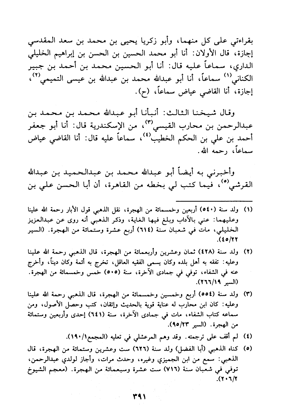 بِقِرَاءَتِي على كل منهما، وأبو زكريا يحيى بْن مُحَمَّد بْن سعد الْمَقْدِسِيّ إجازة، قَالَ الأولان: أنا أَبُو محمد الحسين بْن الحسن بْن إبراهيم الخليلي الداري، سماعا عليه، قَالَ: أنا أَبُو الحسين مُحَمَّد بْن أَحْمَد بْن جبير الكناني سماعا، أنا أَبُو عَبْد اللَّه محمد بْن عَبْد اللَّه بْن عيسى التميمي، إجازة، أنا القاضي عياض سماعا، ح وقال شيخنا الثالث: أنبأنا أَبُو عَبْد اللَّه مُحَمَّد بْن مُحَمَّد بْن عَبْد الرحمن بْن محارب القيسي، من الإسكندرية قَالَ: أنا أَبُو جعفر أَحْمَد بْن علي بْن الحكم الخطيب، سماعا عليه قَالَ: أنا القاضي عياض سماعا، رحمه اللَّه وأخبرني به أيضا أَبُو عَبْد اللَّه مُحَمَّد بْن عَبْد الحميد بْن عَبْد اللَّه القرشي، فيما كتب لي بخطه من القاهرة، أن أبا الحسن علي بْن