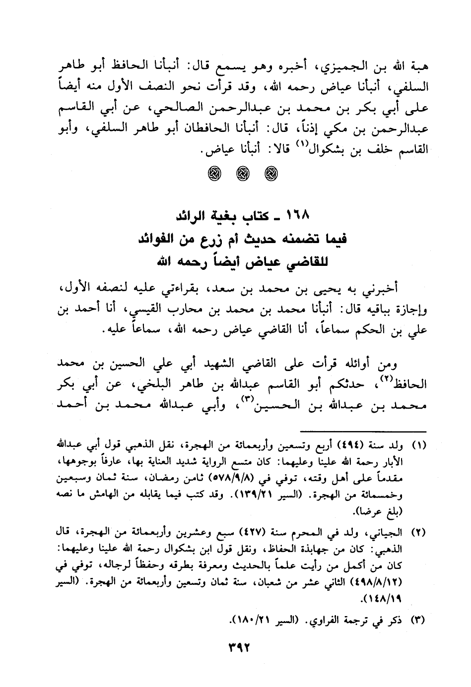 اللَّه، وقد قرأت نحو النصف الأول منه أيضا على أَبِي بكر بْن مُحَمَّد بْن عَبْد الرحمن الصالحي، عن أَبِي الْقَاسِم عَبْد الرحمن بْن مكي إذنا، قَالَ: أنبأنا الحافظان أَبُو طاهر السلفي، وأبو الْقَاسِم خلف بْن بشكوال قالا: أنبأنا عياض