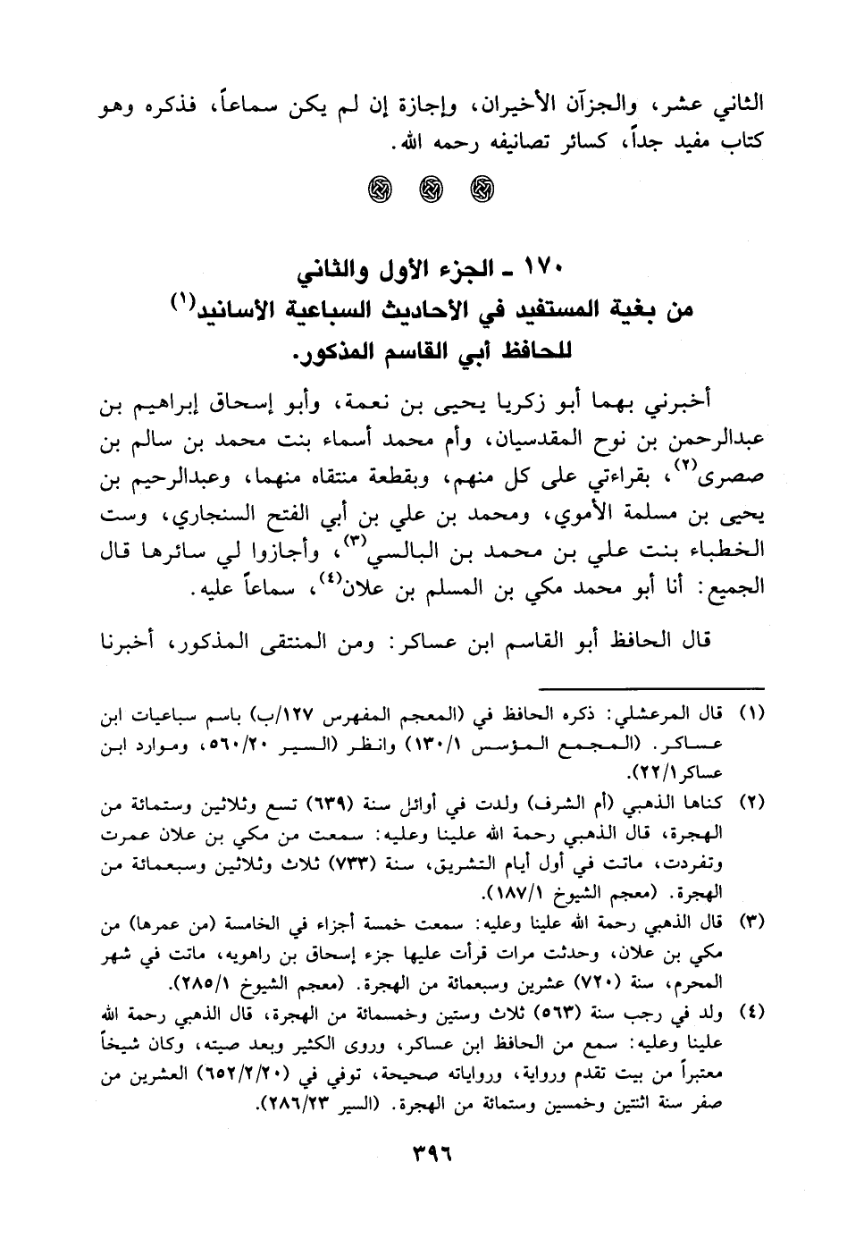 أخبرني بهما أَبُو زكريا يحيى بْن نعمة، وأبو إسحاق إبراهيم بْن عَبْد الرحمن بْن نوح الْمَقْدِسِيّان، وأم مُحَمَّد أسماء بنت مُحَمَّد بْن سالم بْن صصرى، بِقِرَاءَتِي على كل منهم، وبقطعة منتقاة منهما، وعبد الرحيم بْن يحيى بْن مسلمة الأموي، ومحمد بْن علي بْن أَبِي الفتح السنجاري، وست الخطباء بنت علي بْن مُحَمَّد بْن البالسي، وأجازوا لي سائرها، قَالَ الجميع: أنا أَبُو محمد مكي بْن المسلم بْن علان، سماعا عليه قال الحافظ أَبُو الْقَاسِم بْن عساكر: ومن المنتقى المذكور