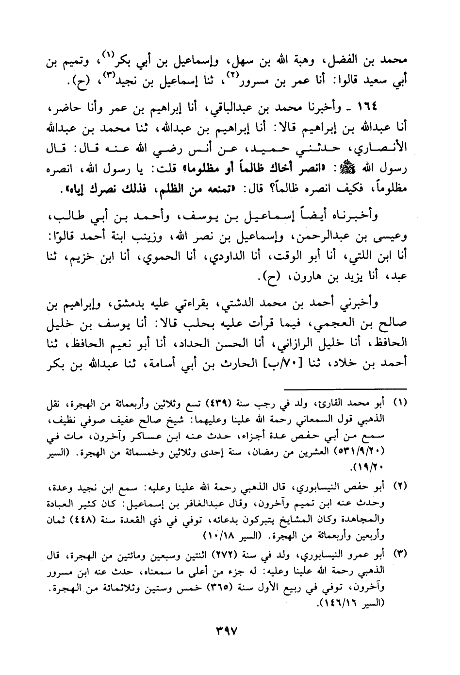 164 - وَأَخْبَرَنَا مُحَمَّدُ بْنُ عَبْدِ الْبَاقِي، أنا إِبْرَاهِيمُ بْنُ عُمَرَ وَأَنَا حَاضِرٌ، أنا عَبْدُ اللَّهِ بْنُ إِبْرَاهِيمَ قَالا: أنا إِبْرَاهِيمُ بْنُ عَبْدِ اللَّهِ، ثنا مُحَمَّدُ بْنُ عَبْدِ اللَّهِ الأَنْصَارِيُّ، حَدَّثَنِي حُمَيْدٌ، عَنْ أَنَسٍ رَضِيَ اللَّهُ عَنْهُ قَالَ: قَالَ رَسُولُ اللَّهِ صَلَّى اللَّهُ عَلَيْهِ وَسَلَّمَ: " انْصُرْ أَخَاكَ ظَالِمًا أَوْ مَظْلُومًا "، قُلْتُ: يَا رَسُولَ اللَّهِ، أَنْصُرْهُ مَظْلُومًا، فَكَيْفَ أَنْصُرُهُ ظَالِمًا؟ قَالَ: " تَمْنَعُهُ مِنَ الظُّلْمِ، فَذَلِكَ نَصْرُكَ إِيَّاهُ " وَأَخْبَرَنَاهُ أَيْضًا إِسْمَاعِيلُ بْنُ يُوسُفَ، وَأَحْمَدُ بْنُ أَبِي طَالِبٍ، وَعِيسَى بْنُ عَبْدِ الرَّحْمَنِ، وَإِسْمَاعِيلُ بْنُ نَصْرِ اللَّهِ، وَزَيْنَبُ ابْنَةُ أَحْمَدَ قَالُوا: أنا ابْنُ اللَّتِّيِّ، أنا أَبُو الْوَقْتِ، أنا الدَّاوُدِيُّ، أنا الْحَمَوِيُّ، أنا ابْنُ خُزَيْمٍ، ثنا عَبْدٌ، أنا يَزِيدُ بْنُ هَارُونَ، ح وَأَخْبَرَنِي أَحْمَدُ بْنُ مُحَمَّدٍ الدَّشْتِيُّ، بِقِرَاءَتِي عَلَيْهِ بِدِمَشْقَ، وَإِبْرَاهِيمُ بْنُ صَالِحِ بْنِ الْعَجَمِيِّ، فِيمَا قَرَأْتُ عَلَيْهِ بِحَلَبَ قَالا: أنا يُوسُفُ بْنُ خَلِيلٍ الْحَافِظُ، أنا خَلِيلٌ الرَّازَانِيُّ، أنا الْحَسَنُ الْحَدَّادُ، أنا أَبُو نُعَيْمٍ الْحَافِظُ، ثنا أَحْمَدُ بْنُ خَلادٍ، ثنا الْحَارِثُ بْنُ أَبِي أُسَامَةَ، ثنا عَبْدُ اللَّهِ بْنُ بَكْرٍ