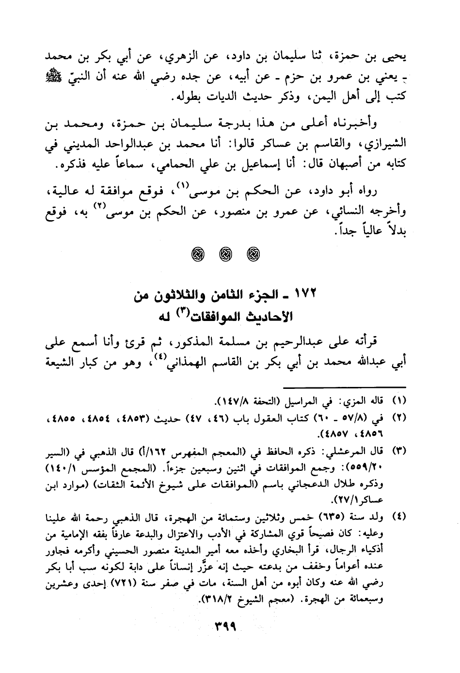 يَحْيَى بْنُ حَمْزَةَ، ثنا سُلَيْمَانُ بْنُ دَاوُدَ، عَنِ الزُّهْرِيِّ، عَنْ أَبِي بَكْرِ بْنِ مُحَمَّدٍ يَعْنِي ابْنَ عَمْرِو بْنِ حَزْمٍ، عَنْ أَبِيهِ، عَنْ جَدِّهِ رَضِيَ اللَّهُ عَنْهُ أَنَّ النَّبِيَّ صَلَّى اللَّهُ عَلَيْهِ وَسَلَّمَ " كَتَبَ إِلَى أَهْلِ الْيَمَنِ " وَذَكَرَ حَدِيثَ الدِّيَاتِ بِطُولِهِ وَأَخْبَرَنَاهُ أَعْلَى مِنْ هَذَا بِدَرَجَةٍ سُلَيْمَانُ بْنُ حَمْزَةَ، وَمُحَمَّدُ بْنُ الشِّيرَازِيِّ، وَالْقَاسِمُ بْنُ عَسَاكِرَ قَالُوا: أنا مُحَمَّدُ بْنُ عَبْدِ الْوَاحِدِ الْمَدِينِيُّ فِي كِتَابِهِ مِنْ أَصْبَهَانَ قَالَ: أنا إِسْمَاعِيلُ بْنُ عَلِيٍّ الْحَمَامِيُّ، سَمَاعًا عَلَيْهِ فَذَكَرَهُ رَوَاهُ أَبُو دَاوُدَ، عَنِ الْحَكَمِ بْنِ مُوسَى، فَوَقَعَ مُوَافَقَةً لَهُ عَالِيَةً، وَأَخْرَجَهُ النَّسَائِيُّ، عَنْ عَمْرِو بْنِ مَنْصُورٍ، عَنِ الْحَكَمِ بْنِ مُوسَى بِهِ، فَوَقَعَ بَدَلا عَالِيًا جِدًّا