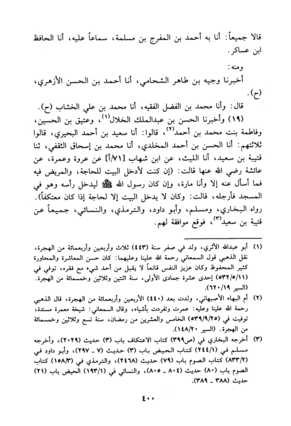 أَخْبَرَنَا وَجِيهُ بْنُ طَاهِرٍ الشَّحَّامِيُّ، أنا أَحْمَدُ بْنُ الْحَسَنِ الأَزْهَرِيُّ، ح قَالَ: وَأنا مُحَمَّدُ بْنُ الْفَضْلِ الْفَقِيهُ، أنا مُحَمَّدُ بْنُ عَلِيٍّ الْخَشَّابُ ح وَأَخْبَرَنَا الْحَسَنُ بْنُ عَبْدِ الْمَلِكِ الْخَلالُ، وَعَتِيقُ بْنُ الْحُسَيْنِ، وَفَاطِمَةُ بِنْتُ مُحَمَّدِ بْنِ أَحْمَدَ، قَالُوا: أنا سَعِيدُ بْنُ أَحْمَدَ الْبَحِيرِيُّ، قَالُوا ثَلاثَتُهُمْ: أنا الْحَسَنُ بْنُ أَحْمَدَ الْمَخْلَدِيُّ، أنا مُحَمَّدُ بْنُ إِسْحَاقَ الثَّقَفِيُّ، ثنا قُتَيْبَةُ بْنُ سَعِيدٍ، أنا اللَّيْثُ، عَنِ ابْنِ شِهَابٍ، عَنْ عُرْوَةَ، وَعَمْرَةَ، عَنْ عَائِشَةَ رَضِيَ اللَّهُ عَنْهَا قَالَتْ: " إِنْ كُنْتُ لأَدْخُلُ الْبَيْتَ لِلْحَاجَةِ وَالْمَرِيضُ فِيهِ، فَمَا أَسْأَلُ عَنْهُ إِلا وَأَنَا مَارَّةٌ، وَإِنْ كَانَ رَسُولُ اللَّهِ صَلَّى اللَّهُ عَلَيْهِ وَسَلَّمَ لَيُدْخِلُ رَأْسَهُ وَهُوَ فِي الْمَسْجِدِ فَأُرَجِّلُهُ، قَالَتْ: وَكَانَ لا يَدْخُلُ الْبَيْتَ إِلا لِحَاجَةٍ إِذَا كَانَ مُعْتَكِفًا " رَوَاهُ الْبُخَارِيُّ، وَمُسْلِمٌ، وَأَبُو دَاوُدَ، وَالتِّرْمِذِيُّ، وَالنَّسَائِيُّ، جَمِيعًا عَنْ قُتَيْبَةَ بْنِ سَعِيدٍ، فَوَقَعَ مُوَافَقَةً لَهُمْ.
