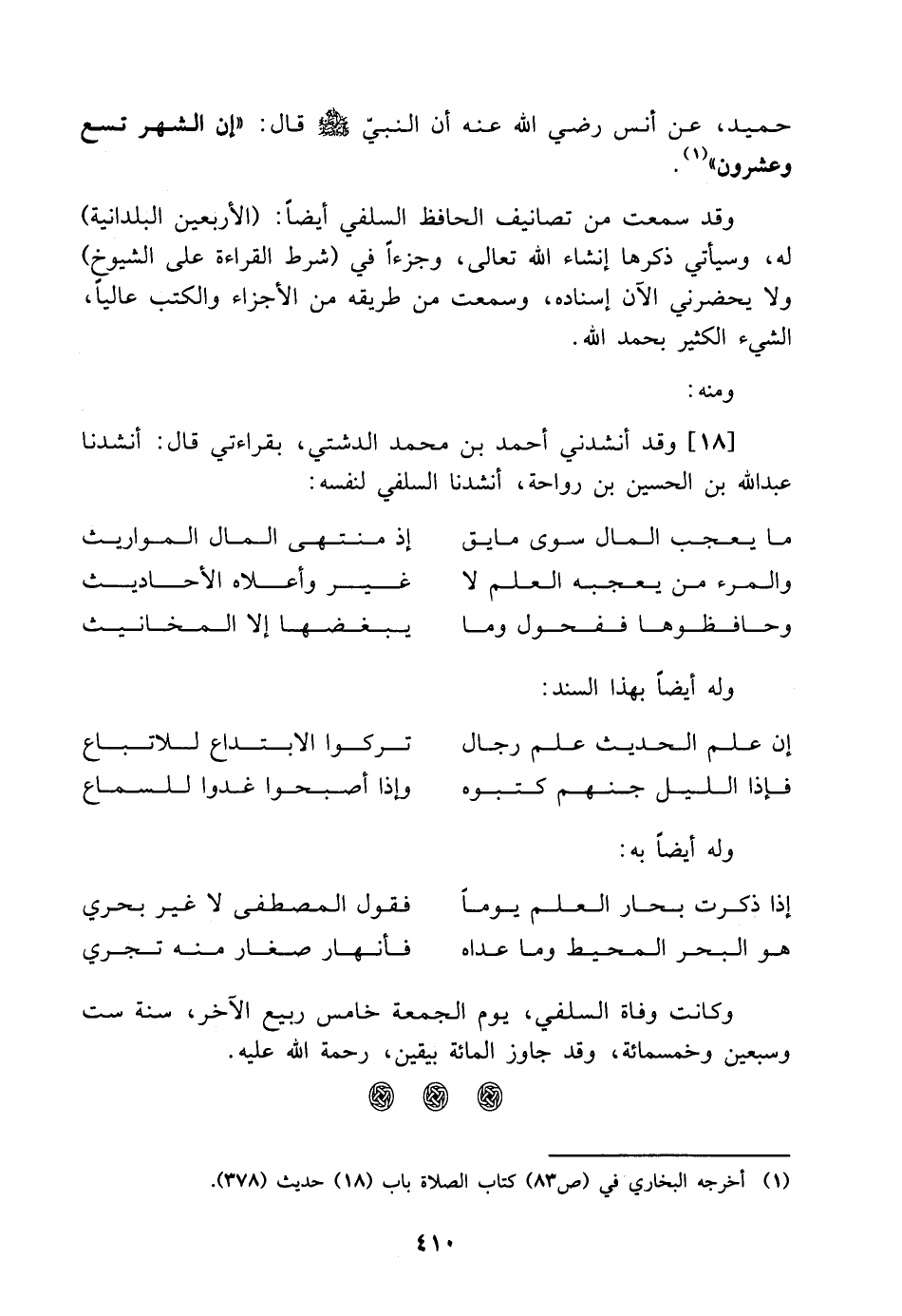 حُمَيْدٌ، عَنْ أَنَسٍ رَضِيَ اللَّهُ عَنْهُ أَنَّ النَّبِيَّ صَلَّى اللَّهُ عَلَيْهِ وَسَلَّمَ قَالَ: " إِنَّ الشَّهْرَ تِسْعٌ وَعِشْرُونَ " وقد سمعت من تصانيف الحافظ السلفي أيضا: الأربعين البلدانية له، وسيأتي ذكرها إن شاء اللَّه تعالى، وجزءا في شرط القراءة على الشيوخ ولا يحضرني الآن إسناده، وسمعت من طريقه من الأجزاء والكتب عاليا، الشيء الكثير بحمد اللَّه ومنه: