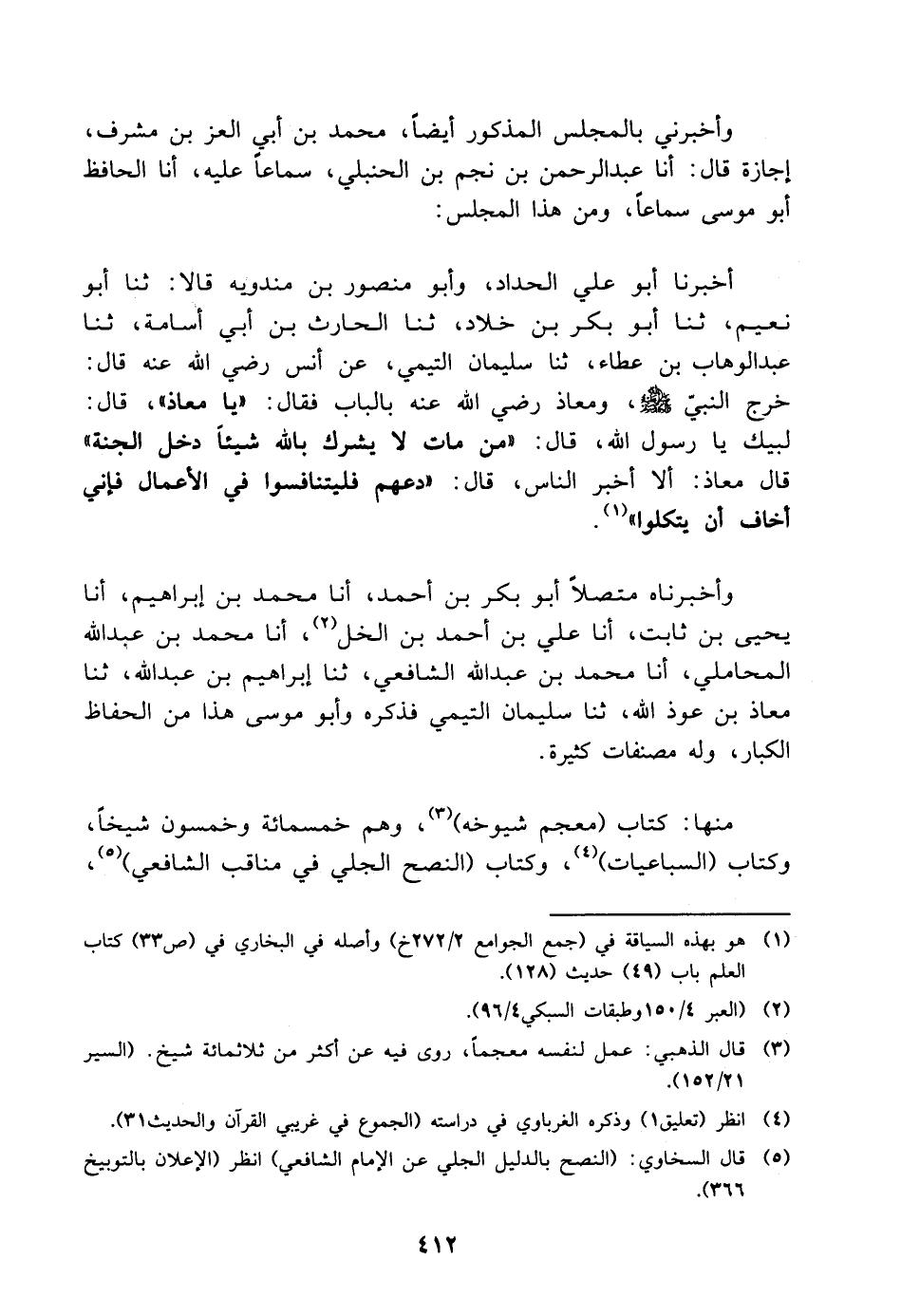169 - أَخْبَرَنَا أَبُو عَلِيٍّ الْحَدَّادُ، وَأَبُو مَنْصُورِ بْنُ مَنْدُوَيْهِ قَالا: ثنا أَبُو نُعَيْمٍ، ثنا أَبُو بَكْرِ بْنُ خَلادٍ، ثنا الْحَارِثُ بْنُ أَبِي أُسَامَةَ، ثنا عَبْدُ الْوَهَّابِ بْنُ عَطَاءٍ، ثنا سُلَيْمَانُ التَّيْمِيُّ، عَنْ أَنَسٍ رَضِيَ اللَّهُ عَنْهُ قَالَ: خَرَجَ النَّبِيُّ صَلَّى اللَّهُ عَلَيْهِ وَسَلَّمَ، وَمُعَاذٌ رَضِيَ اللَّهُ عَنْهُ بِالْبَابِ فَقَالَ: " يَا مُعَاذَ "، قَالَ: لَبَّيْكَ يَا رَسُولَ اللَّهِ، قَالَ: " مَنْ مَاتَ لا يُشْرِكُ بِاللَّهِ شَيْئًا دَخَلَ الْجَنَّةَ " قَالَ مُعَاذٌ: أَلا أُخْبِرُ النَّاسَ، قَالَ: " دَعْهُمْ فَلْيَتَنَافَسُوا فِي الأَعْمَالِ فَإِنِّي أَخَافُ أَنْ يَتَّكِلُوا " وَأَخْبَرَنَاهُ مُتَّصِلا أَبُو بَكْرِ بْنُ أَحْمَدَ، أنا مُحَمَّدُ بْنُ إِبْرَاهِيمَ، أنا يَحْيَى بْنُ ثَابِتٍ، أنا عَلِيُّ بْنُ أَحْمَدَ بْنِ الْخَلِّ، أنا مُحَمَّدُ بْنُ عَبْدِ اللَّهِ الْمَحَامِلِيُّ، أنا مُحَمَّدُ بْنُ عَبْدِ اللَّهِ الشَّافِعِيُّ، ثنا إِبْرَاهِيمُ بْنُ عَبْدِ اللَّهِ، ثنا مُعَاذُ بْنُ عَوْذِ اللَّهِ، ثنا سُلَيْمَانُ التَّيْمِيُّ فَذَكَرَهُ وأبو موسى هذا من الحفاظ الكبار، وله مصنفات كثيرة منها: كتاب معجم شيوخه، وهم خمس مائة وخمسون شيخا، وكتاب السباعيات، وكتاب النصح الجلي في مناقب الشافعي،