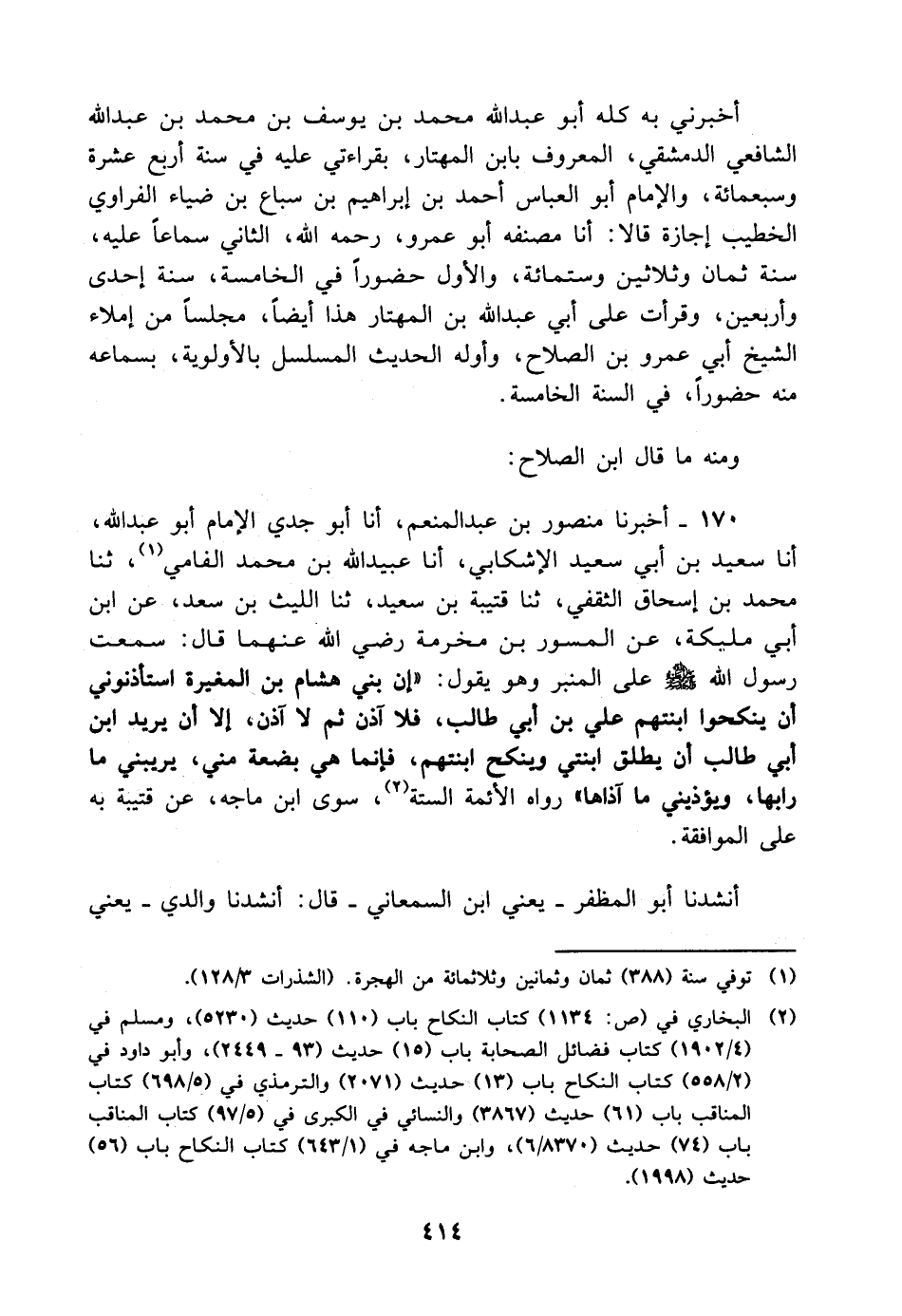 أخبرني به كله أَبُو عَبْد اللَّه مُحَمَّد بْن يوسف بْن مُحَمَّد بْن عَبْد اللَّه الشافعي الدمشقي، المعروف بابن المهتار، بِقِرَاءَتِي عليه في سنة أربع عشرة وسبع مائة، والإمام أَبُو العباس أَحْمَد بْن إبراهيم بْن سباع بْن ضياء الفراوي الخطيب إجازة قالا: أنا مصنفه أَبُو عمرو رحمه اللَّه الثاني سماعا عليه، سنة ثمان وثلاثين وست مائة، والأول حضورا في الخامسة، سنة إحدى وأربعين، وقرأت على أَبِي عَبْد اللَّه بْن المهتار هذا أيضا، مجلسا من إملاء الشيخ أَبِي عمرو بْن الصلاح، وأوله الحديث المسلسل بالأولوية، بسماعه منه حضورا، في السنة الخامسة ومنه ما قَالَ ابن الصلاح:
