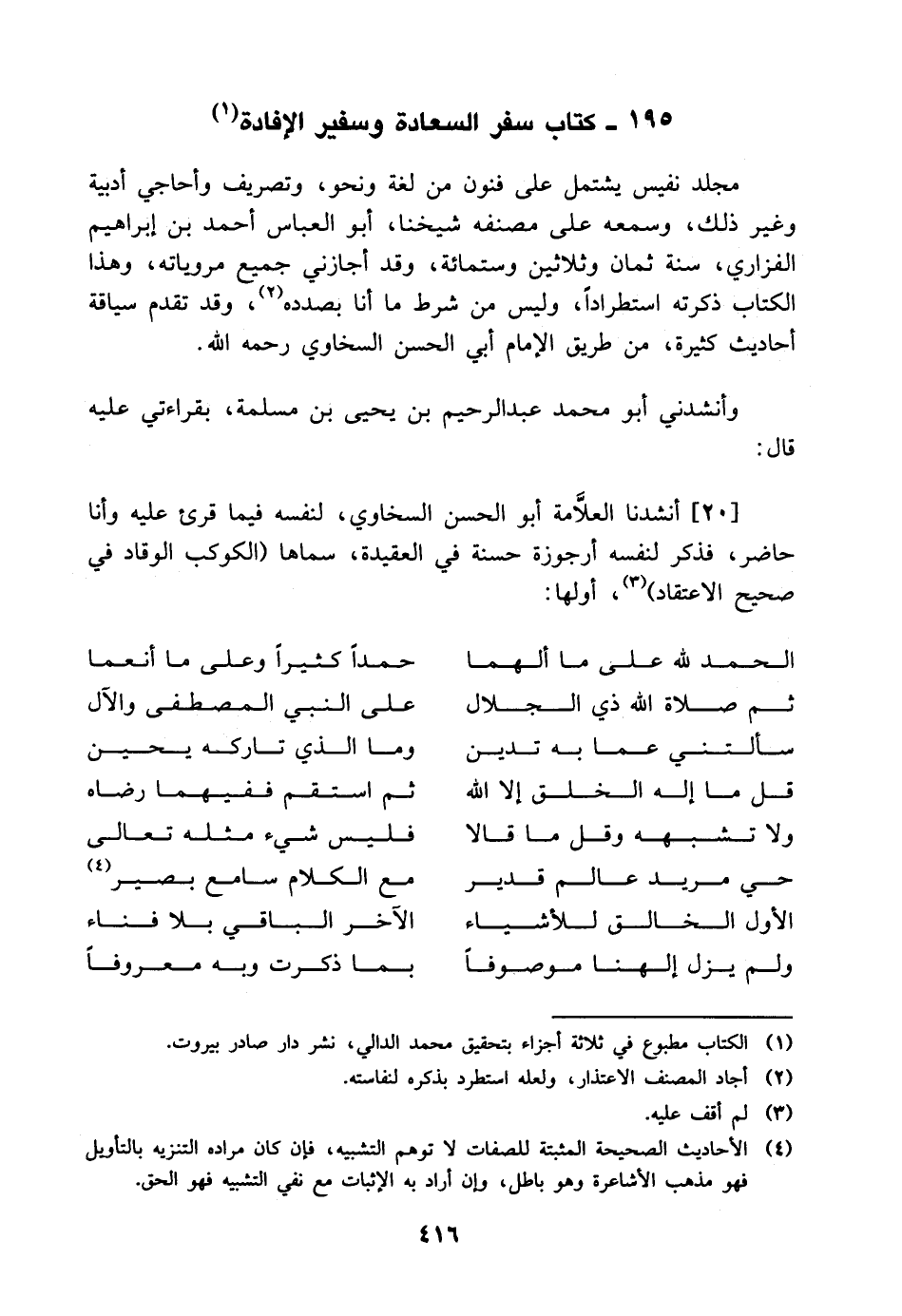 مجلد نفيس يشتمل على فنون من لغة ونحو، وتصريف وأحاجي أدبية وغير ذلك، وسمعه على مصنفه شيخنا، أَبُو العباس أَحْمَد بْن إبراهيم الفزاري، سنة ثمان وثلاثين وست مائة، وقد أجازني جميع مروياته، وهذا الكتاب ذكرته استطرادا، وليس من شرط ما أنا بصدده، وقد تقدم سياقه أحاديث كثيرة، من طريق الإمام أَبِي الحسن السخاوي رحمه اللَّه وَأَنْشَدَنِي أَبُو مُحَمَّدٍ عَبْدُ الرَّحِيمِ بْنُ يَحْيَى بْنِ مَسْلَمَةَ، بِقِرَاءَتِي عَلَيْهِ قَالَ: أَنْشَدَنَا الْعَلامَةُ أَبُو الْحَسَنِ السّخَاوِيُّ، لِنَفْسِهِ فِيمَا قُرِئَ عَلَيْهِ وَأَنَا حَاضِرٌ، فَذَكَرَ لِنَفْسِهِ أُرْجُوزَةً حَسَنَةً فِي الْعَقِيدَةِ، سَمَّاهَا الْكَوْكَبَ الْوَقَّادَ فِي صَحِيحِ الاعْتِقَادِ، أَوَّلُهَا:
