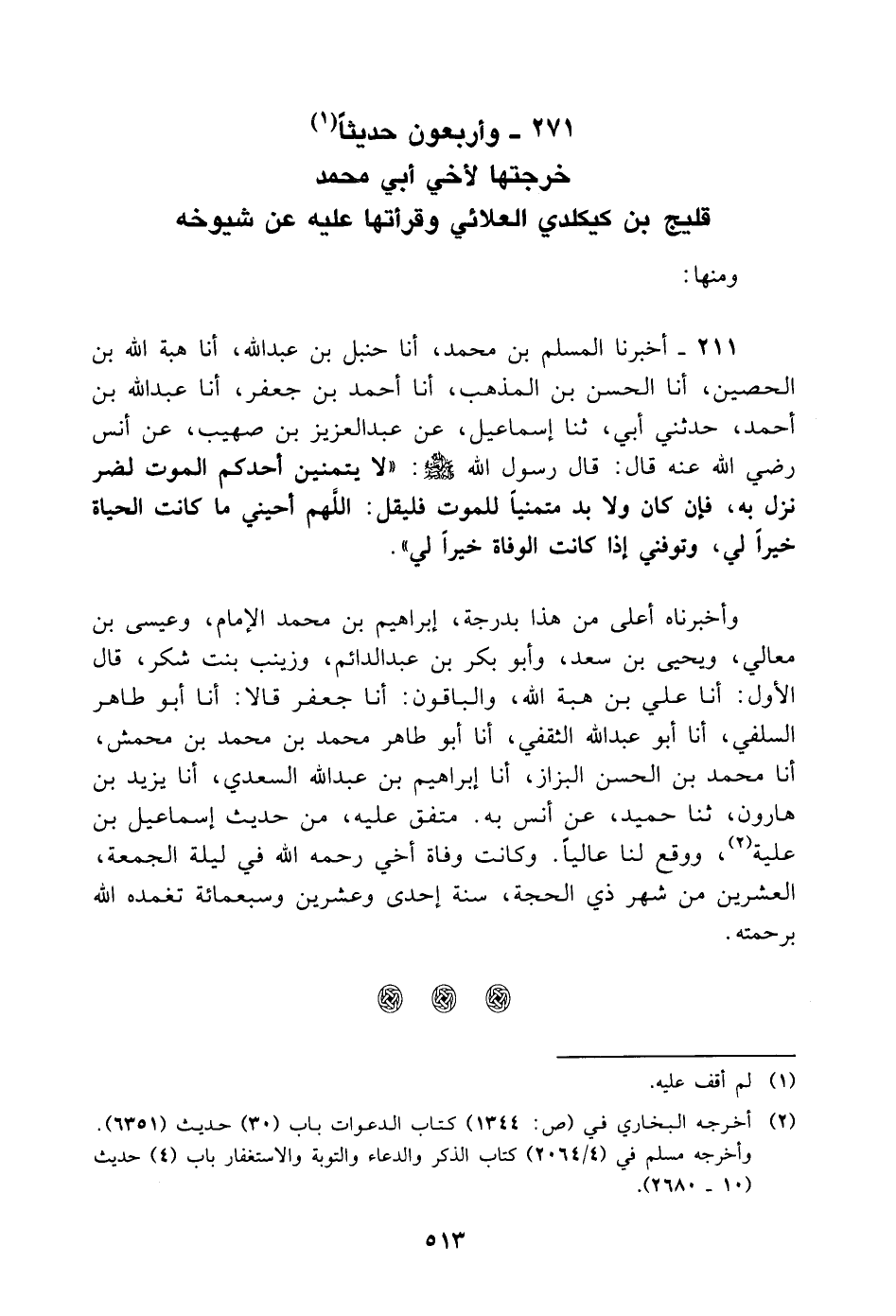 211 - أَخْبَرَنَا الْمُسْلِمُ بْنُ مُحَمَّدٍ، أنا حَنْبَلُ بْنُ عَبْدِ اللَّهِ، أنا هِبَةُ اللَّهِ بْنُ الْحُصَيْنِ، أنا الْحَسَنُ بْنُ الْمُذْهِبِ، أنا أَحْمَدُ بْنُ جَعْفَرٍ، أنا عَبْدُ اللَّهِ بْنُ أَحْمَدَ، حَدَّثَنِي أَبِي، ثنا إِسْمَاعِيلُ، عَنْ عَبْدِ الْعَزِيزِ بْنِ صُهَيْبٍ، عَنْ أَنَسٍ، رَضِيَ اللَّهُ عَنْهُ، قَالَ: قَالَ رَسُولُ اللَّهِ، صَلَّى اللَّهُ عَلَيْهِ وَسَلَّمَ: " لا يَتَمَنَّيَنَّ أَحَدُكُمُ الْمَوْتَ لِضُرٍّ نَزَلَ بِهِ، فَإِنْ كَانَ وَلا بُدَّ مُتَمَنِّيًا لِلْمَوْتِ فَلْيَقُلِ: اللَّهُمَّ أَحْيِني مَا كَانَتِ الْحَيَاةُ خَيْرًا لِي، وَتَوَفَّنِي إِذَا كَانَتِ الْوَفَاةُ خَيْرًا لِي " وَأَخْبَرَنَاهُ أَعْلَى مِنْ هَذَا بِدَرَجَةٍ، إِبْرَاهِيمُ بْنُ مُحَمَّدٍ الإِمَامُ، وَعِيسَى بْنُ مَعَالِي، وَيَحْيَى بْنُ سَعْدٍ، وَأَبُو بَكْرِ بْنُ عَبْدِ الدَّائِمِ، وَزَيْنَبُ بِنْتُ شُكْرٍ، قَالَ الأَوَّلُ: أنا عَلِيُّ بْنُ هِبَةِ اللَّهِ، وَالْبَاقُونَ: أنا جَعْفَرٌ، قَالا: أنا أَبُو طَاهِرٍ السِّلَفِيُّ، أنا أَبُو عَبْدِ اللَّهِ الثَّقَفِيُّ، أنا أَبُو طَاهِرٍ مُحَمَّدُ بْنُ مُحَمَّدِ بْنِ مَحْمِشٍ، أنا مُحَمَّدُ بْنُ الْحَسَنِ الْبَزَّازُ، أنا إِبْرَاهِيمُ بْنُ عَبْدِ اللَّهِ السَّعْدِيُّ، أنا يَزِيدُ بْنُ هَارُونَ، ثنا حُمَيْدٌ، عَنْ أَنَسٍ، بِهِ مُتَّفَقٌ عَلَيْهِ، مِنْ حَدِيثِ إِسْمَاعِيلَ ابْنِ عُلَيَّةَ، وَوَقَعَ لَنَا عَالِيًا وَكَانَتْ وَفَاةُ أَخِي، رَحِمَهُ اللَّهُ، فِي لَيْلَةِ الْجُمُعَةِ، الْعِشْرِينَ مِنْ شَهْرِ ذِي الْحِجَّةِ، سَنَةَ إِحْدَى وَعِشْرِينَ وَسَبْعِ مِائَةٍ، تَغَمَّدَهُ اللَّهُ بِرَحْمَتِهِ