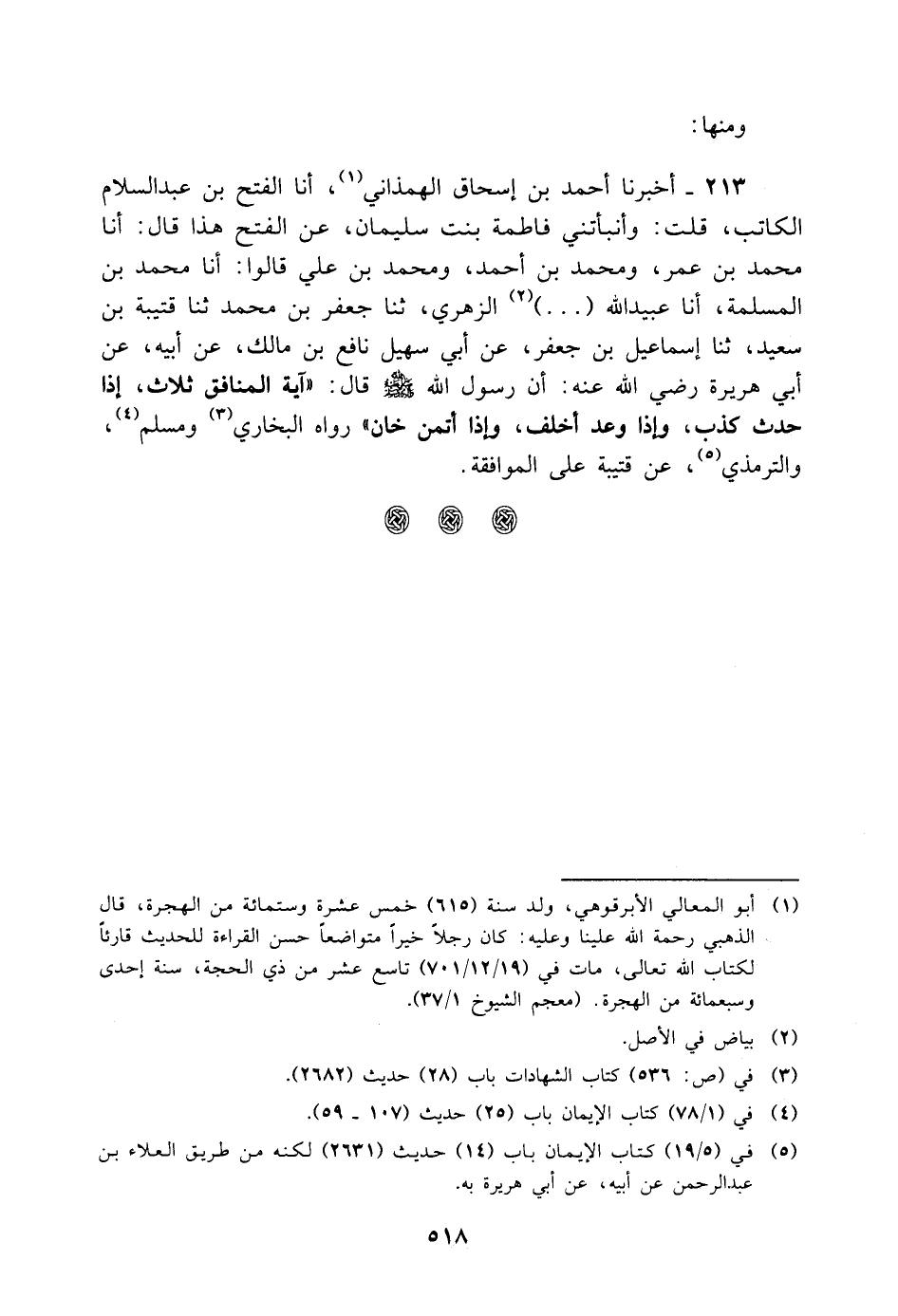 213 - أَخْبَرَنَا أَحْمَدُ بْنُ إِسْحَاقَ الْهَمَذَانِيُّ، أنا الْفَتْحُ بْنُ عَبْدِ السَّلامِ الْكَاتِبُ قُلْتُ: وَأَنْبَأَتْنِي فَاطِمَةُ بِنْتُ سُلَيْمَانَ، عَنِ الْفَتْحِ، هَذَا، قَالَ: أنا مُحَمَّدُ بْنُ عُمَرَ، وَمُحَمَّدُ بْنُ أَحْمَدَ، وَمُحَمَّدُ بْنُ عَلِيٍّ، قَالُوا: أنا مُحَمَّدُ بْنُ الْمُسْلِمَةِ، أنا عُبَيْدُ اللَّهِ الزُّهْرِيُّ، ثنا جَعْفَرُ بْنُ مُحَمَّدٍ، ثنا قُتَيْبَةُ بْنُ سَعِيدٍ، ثنا إِسْمَاعِيلُ بْنُ جَعْفَرٍ، عَنْ أَبِي سُهَيْلٍ نَافِعِ بْنِ مَالِكٍ، عَنْ أَبِيهِ، عَنْ أَبِي هُرَيْرَةَ، رَضِيَ اللَّهُ عَنْهُ: أَنَّ رَسُولَ اللَّهِ، صَلَّى اللَّهُ عَلَيْهِ وَسَلَّمَ، قَالَ: " آيَةُ الْمُنَافِقِ ثَلاثٌ: إِذَا حَدَّثَ كَذَبَ، وَإِذَا وَعَدَ أَخْلَفَ، وَإِذَا اؤْتُمِنَ خَانَ " رَوَاهُ الْبُخَارِيُّ، وَمُسْلِمٌ، وَالتِّرْمِذِيُّ، عَنْ قُتَيْبَةَ، عَلَى الْمُوَافَقَةِ