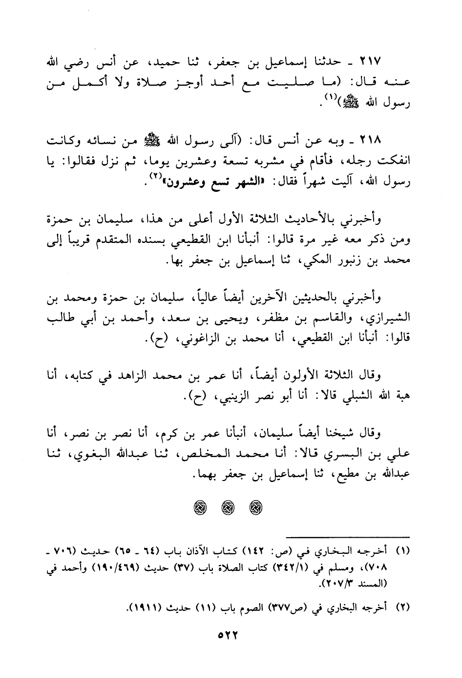 218 - وَبِهِ عَنْ أَنَسٍ، قَالَ: آلَى رَسُولُ اللَّهِ، صَلَّى اللَّهُ عَلَيْهِ وَسَلَّمَ، مِنْ نِسَائِهِ وَكَانَتِ انْفَكَّتْ رِجْلُهُ، فَأَقَامَ فِي مَشْرَبِهِ تِسْعَةً وَعِشْرِينَ يَوْمًا، ثُمَّ نَزَلَ فَقَالُوا: يَا رَسُولَ اللَّهِ، آلَيْتَ شَهْرًا، فَقَالَ: " الشَّهْرُ تِسْعٌ وَعِشْرُونَ " وأخبرني بالأحاديث الثلاثة الأول أعلى من هذا، وسليمان بن حمزة ومن ذكره معه غير مرة قالوا: أنبأنا ابن القطيعي بسنده المتقدم قريبا إلى مُحَمَّد بن زنبور المكي، ثنا إسماعيل بن جعفر بها وأخبرني بالحديثين الآخرين أيضا عاليا، سليمان بن حمزة، وَمُحَمَّد بن الشيرازي، والقاسم بن مظفر، ويحيى بن سعد، وأحمد بن أبي طالب قالوا: أنبأنا ابن القطيعي، أنا مُحَمَّد بن الزاغوني، ح وقال الثلاثة الأولون أيضا: أنا عمر بن مُحَمَّد الزاهد في كتابه، أنا هبة الله الشبلي قالا: أنا أبو نصر الزينبي، ح وقال شيخنا أيضا سليمان، أنبأنا عمر بن كرم، أنا نصر بن نصر، أنا علي بن البسري قالا: أنا مُحَمَّد المخلص، ثنا عبد الله البغوي، ثنا عبد الله بن مطيع، ثنا إسماعيل بن جعفر بهما.