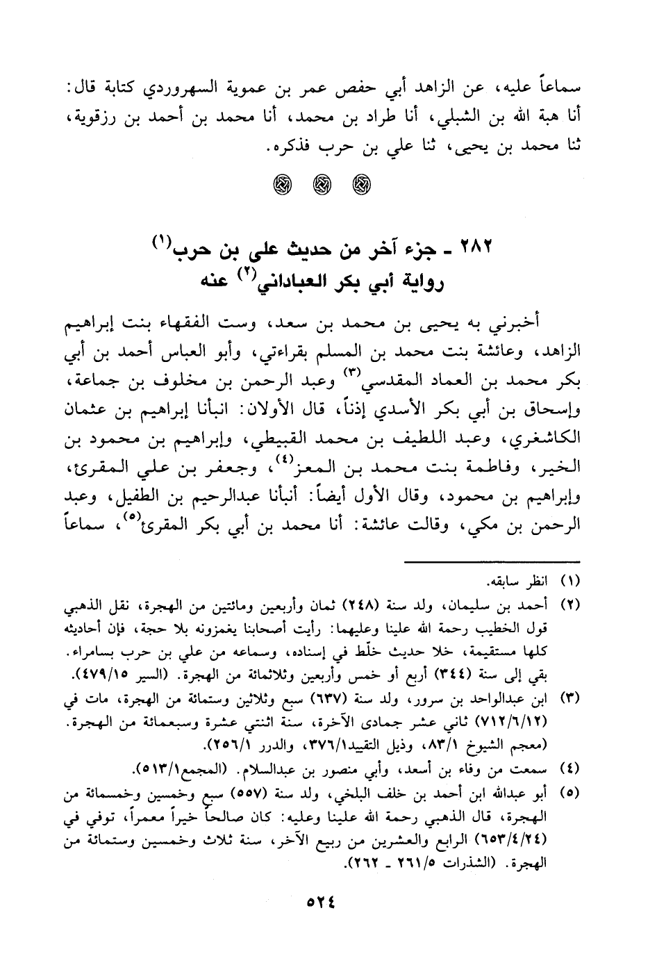 سماعا عليه، عن الزاهد أبي حفص عمر بن عمويه السهروردي كتابة قال: أنا هبة الله بن الشبلي، أنا طراد بن مُحَمَّد، أنا مُحَمَّد بن أحمد بن رزقوية، ثنا مُحَمَّد بن يحيى، ثنا علي بن حرب فذكره