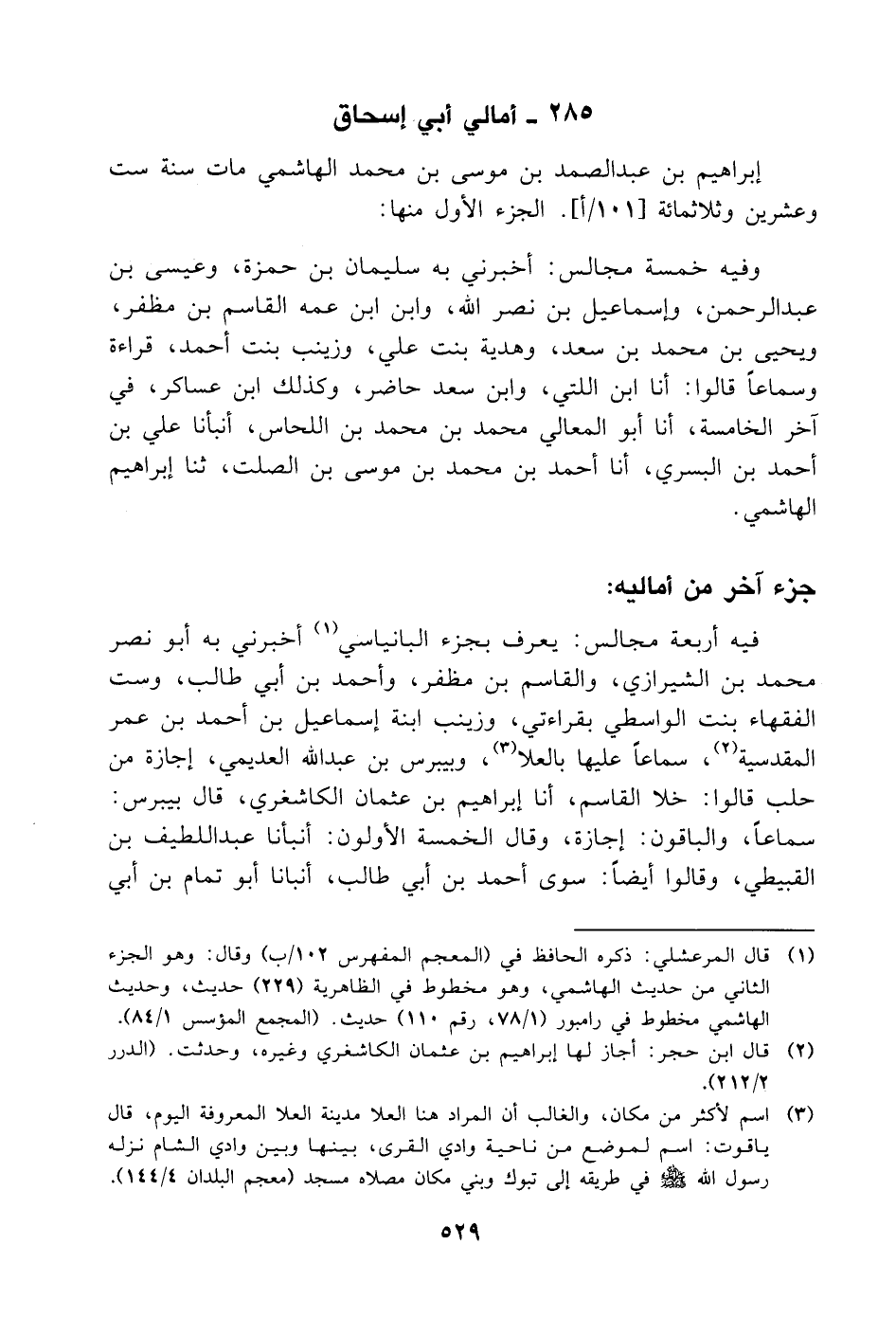 إبراهيم بن عبد الصمد بن موسى بن مُحَمَّد الهاشمي مات سنة ست وعشرين وثلاث مائة الجزء الأول منها: وفيه خمسة مجالس: أخبرني به سليمان بن حمزة، وعيسى بن عبد الرحمن، وإسماعيل بن نصر الله، وابن ابن عمه القاسم بن مظفر، ويحيى بن مُحَمَّد بن سعد، وهدية بنت علي، وزينب بنت أحمد، قراءة وسماعا قالوا: أنا ابن اللتي، وابن سعد حاضر، وكذلك ابن عساكر، في آخر الخامسة، أنا أبو المعالي مُحَمَّد بن مُحَمَّد بن اللحاس، أنبأنا علي بن أحمد بن البسري، أنا أحمد بن مُحَمَّد بن موسى بن الصلت، ثنا إبراهيم الهاشمي