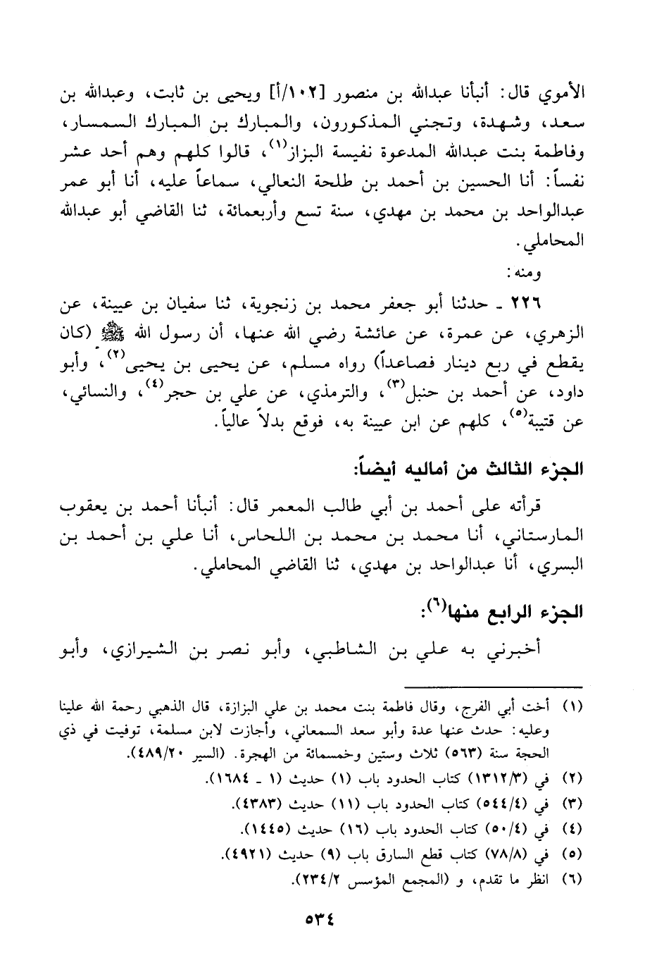الأموي قال: أنبأنا عبد الله بن منصور، ويحيى بن ثابت، وعبد الله بن سعد، وشهدة، وتجني المذكورون، والمبارك بن المبارك السمسار، وفاطمة بنت عبد الله المدعوة نفيسة البزاز، قالوا كلهم وهم أحد عشر نفسا: أنا الحسين بن أحمد بن طلحة النعالي، سماعا عليه، أنا أبو عمر عبد الواحد بن مُحَمَّد بن مهدي، سنة تسع وأربع مائة، ثنا القاضي أبو عبد