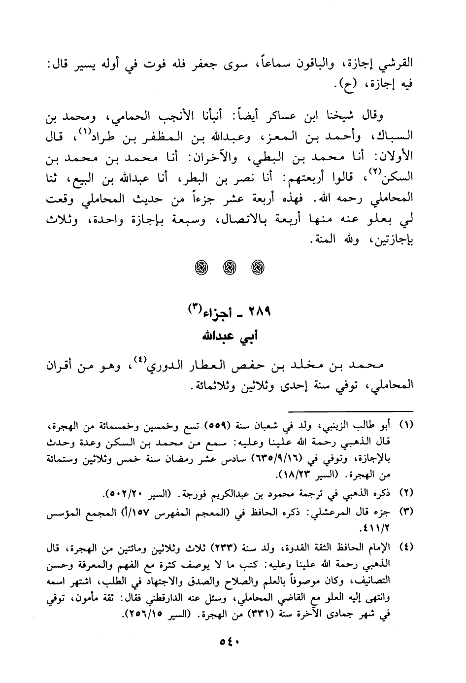 : أنبأنا الأنجب الحمامي، وَمُحَمَّد بن السباك، وأحمد بن المعز، وعبد الله بن المظفر بن طراد، قال الأولان: أنا مُحَمَّد بن البطي، والآخران: أنا مُحَمَّد بن مُحَمَّد بن السكن، قالوا أربعتهم: أنا نصر بن البطر، أنا عبد الله بن البيع، ثنا المحاملي رحمه الله فهذه أربعة عشر جزءا من حديث المحاملي وقعت لي بعلو عنه منها أربعة بالاتصال، وسبعة بإجازة واحدة، وثلاث بإجازتين، ولله المنة
