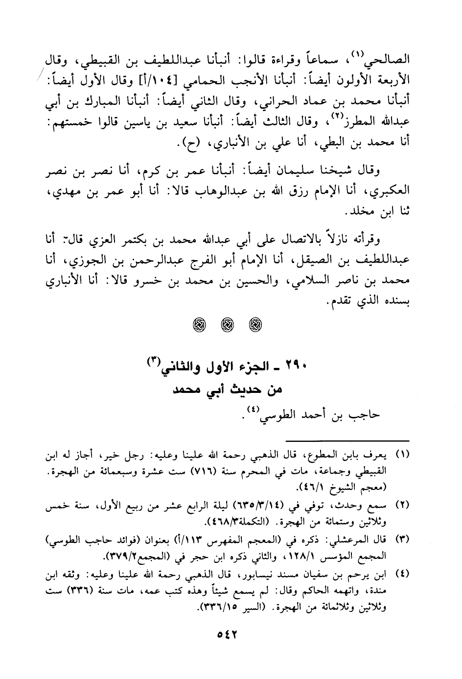 الصالحي، سماعا وقراءة، قالوا: أنبأنا عبد اللطيف بن القبيطي، وقال الأربعة الأولون أيضا: أنبانا الأنجب الحمامي، وقال الأول أيضا: أنبأنا مُحَمَّد بن عماد الحراني، وقال الثاني أيضا: أنبأنا المبارك بن أبي عبد الله المطرز، وقال الثالث أيضا: أنبأنا سعيد بن ياسين قالوا خمستهم: أنا مُحَمَّد بن البطي، أنا علي بن الأنباري، ح وقال شيخنا سليمان أيضا: أنبأنا عمر بن كرم، أنا نصر بن نصر العكبري، أنا الإمام رزق الله بن عبد الوهاب قالا: أنا أبو عمر بن مهدي، ثنا ابن مخلد وقرأته نازلا بالاتصال على أبي عبد الله مُحَمَّد بن بكتمر العزي قال: أنا عبد اللطيف بن الصيقل، أنا الإمام أبو الفرج عبد الرحمن بن الجوزي، أنا مُحَمَّد بن ناصر السلامي، والحسين بن مُحَمَّد بن خسرو قالا: أنا الأنباري بسنده الذي تقدم
