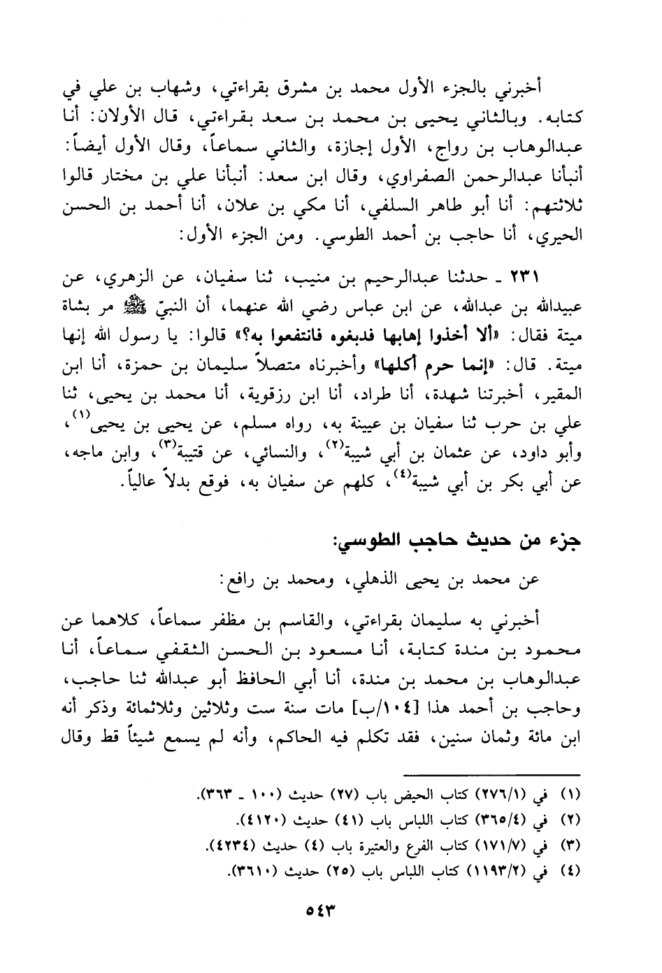 أخبرني بالجزء الأول مُحَمَّد بن مشرق بقراءتي، وشهاب بن علي في كتابه وبالثاني يحيى بن مُحَمَّد بن سعد بقراءتي، قال الأولان: أنا عبد الوهاب بن رواج، الأول إجازة، والثاني سماعا، وقال الأول أيضا: أنبأنا عبد الرحمن الصفراوي، وقال ابن سعد: أنبأنا علي بن مختار قالوا ثلاثتهم: أنا أبو طاهر السلفي، أنا مكي بن علان، أنا أحمد بن الحسن الحيري، أنا حاجب بن أحمد الطوسي ومن الجزء الأول: