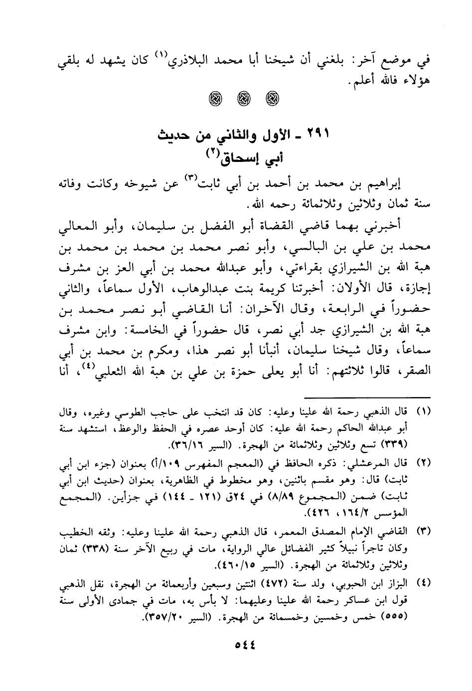 إبراهيم بن مُحَمَّد بن أحمد بن أبي ثابت عن شيوخه وكانت وفاته سنة ثمان وثلاثين وثلاث مائة رحمه الله أخبرني بهما قاضي القضاة أبو الفضل بن سليمان، وأبو المعالي مُحَمَّد بن علي بن البالسي، وأبو نصر مُحَمَّد بن مُحَمَّد بن مُحَمَّد بن هبة الله بن الشيرازي بقراءتي، وأبو عبد الله مُحَمَّد بن أبي العز بن مشرف إجازة، قال الأولان: أخبرتنا كريمة بنت عبد الوهاب، الأول سماعا، والثاني حضورا في الرابعة، وقال الآخران: أنا القاضي أبو نصر مُحَمَّد بن هبة الله بن الشيرازي جد أبي نصر، قال حضورا في الخامسة: وابن مشرف سماعا، وقال شيخنا سليمان، أنبأنا أبو نصر هذا، ومكرم بن مُحَمَّد بن أبي الصقر، قالوا ثلاثتهم: أنا أبو يعلى حمزة بن علي بن هبة الله الثعلبي، أنا