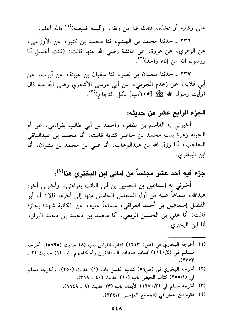 أخبرني به القاسم بن مظفر، وأحمد بن أبي طالب بقراءتي، عن أم الحياء زهرة بنت مُحَمَّد بن حاضر كتابة قالت: أنا مُحَمَّد بن عبد الباقي الحاجب، أنا رزق الله بن عبد الوهاب، أنا علي بن مُحَمَّد بن بشران، أنا ابن البختري