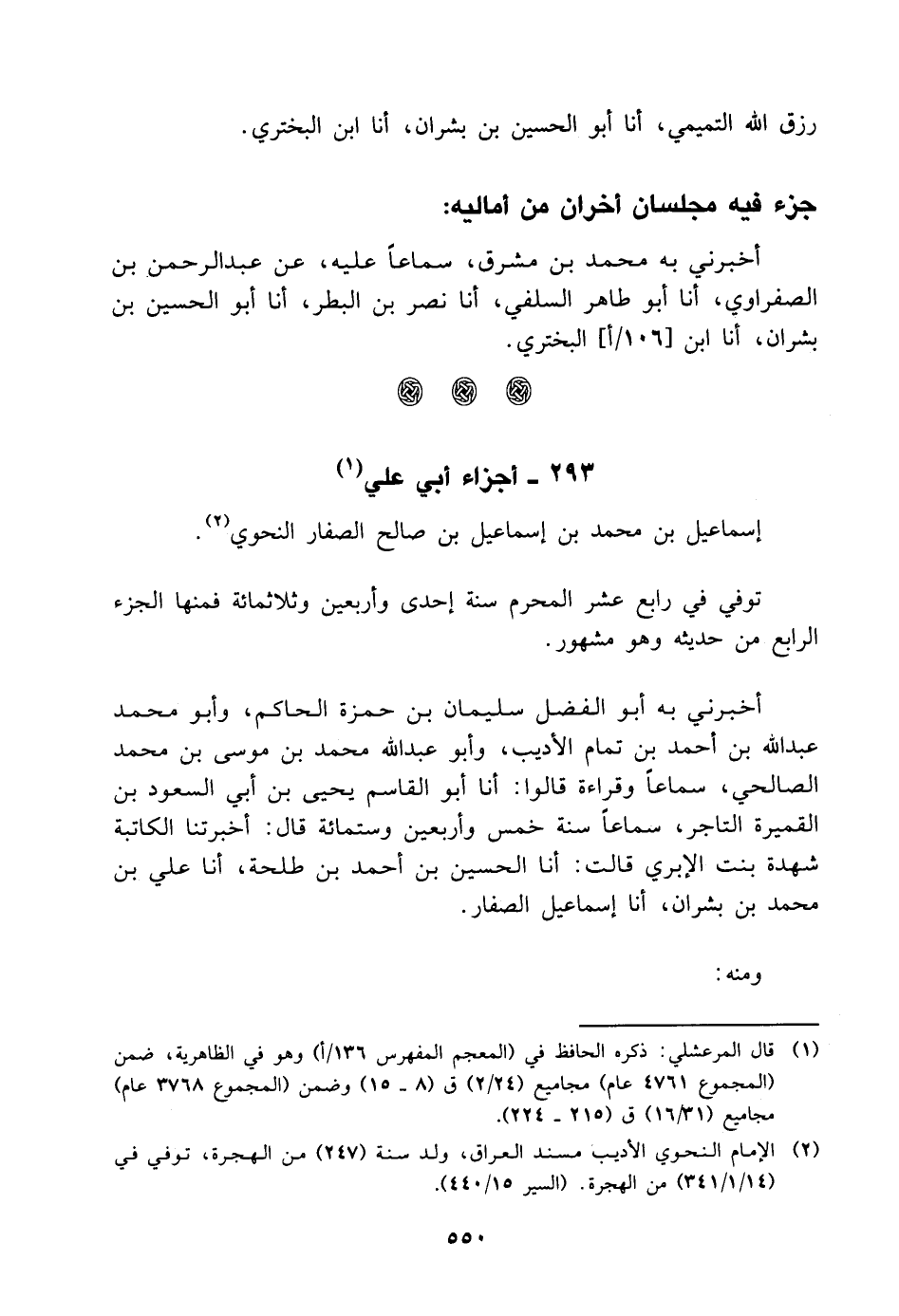 إسماعيل بن مُحَمَّد بن إسماعيل بن صالح الصفار النحوي توفي في رابع عشر المحرم سنة إحدى وأربعين وثلاث مائة فمنها الجزء الرابع من حديثه وهو مشهور أخبرني به أبو الفضل سليمان بن حمزة الحاكم، وأبو مُحَمَّد عبد الله بن أحمد بن تمام الأديب، وأبو عبد الله مُحَمَّد بن موسى بن مُحَمَّد الصالحي، سماعا وقراءة قالوا: أنا أبو القاسم يحيى بن أبي السعود بن القميرة التاجر، سماعا سنة خمس وأربعين وست مائة قال: أخبرتنا الكاتبة شهدة بنت الإبري، قالت: أنا الحسين بن أحمد بن طلحة، أنا علي بن مُحَمَّد بن بشران، أنا إسماعيل الصفار ومنه: