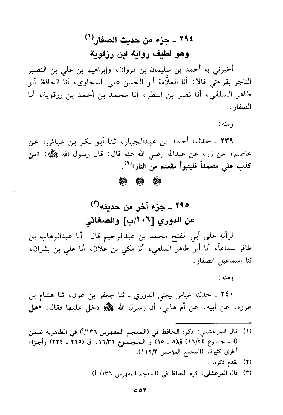 أخبرني به أحمد بن سليمان بن مروان، وإبراهيم بن علي بن النصير التاجر، بقراءتي، قالا: أنا العلامة أبو الحسن علي السخاوي، أنا الحافظ أبو طاهر السلفي، أنا نصر بن البطر، أنا مُحَمَّد بن أحمد بن رزقوية، أنا الصفار ومنه: