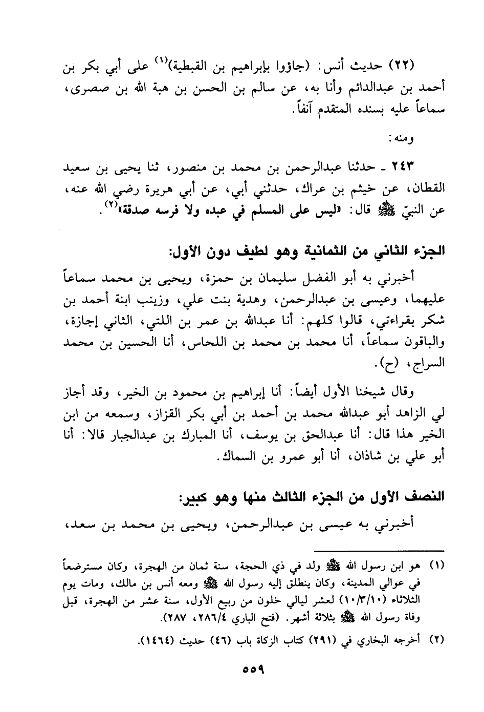 أنس: جاءوا بإبراهيم بن القبطية على أبي بكر بن أحمد بن عبد الدائم وأنا به، عن سالم بن الحسن بن هبة الله بن صصرى سماعا عليه بسنده المتقدم آنفا ومنه: