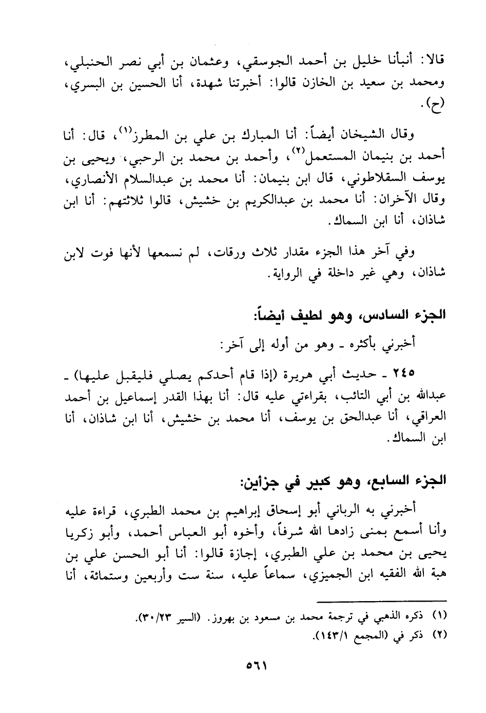قالا: أنبأنا خليل بن أحمد الجوسقي، وعثمان بن أبي نصر الحنبلي، وَمُحَمَّد بن سعيد بن الخازن قالوا: أخبرتنا شهدة، أنا الحسين بن البسري، ح وقال الشيخان أيضا: أنا المبارك بن علي بن المطرز، قال: أنا أحمد بن بنيمان المستعمل، وأحمد بن مُحَمَّد بن الرحبي، ويحيى بن يوسف السقلاطوني، قال ابن بنيمان: أنا مُحَمَّد بن عبد السلام الأنصاري، وقال الآخران: أنا مُحَمَّد بن عبد الكريم بن خشيش، قالوا ثلاثتهم: أنا ابن شاذان، أنا ابن السماك وفي آخر هذا الجزء مقدار ثلاث ورقات، لم نسمعها لأنها فوت لابن شاذان، وهي غير داخلة في الرواية